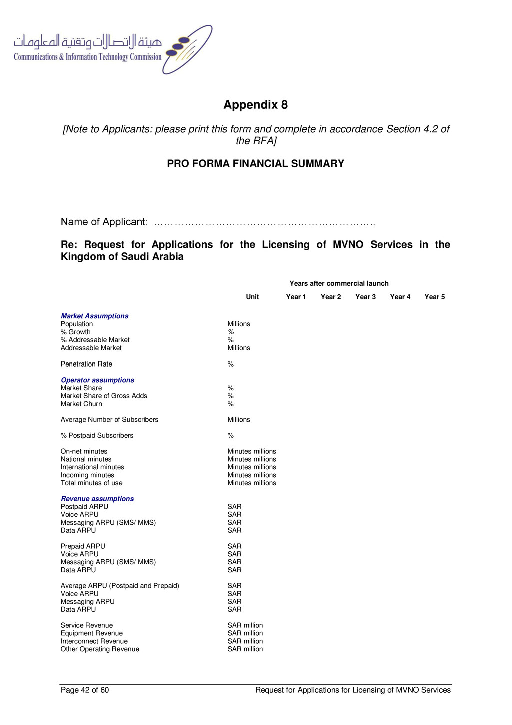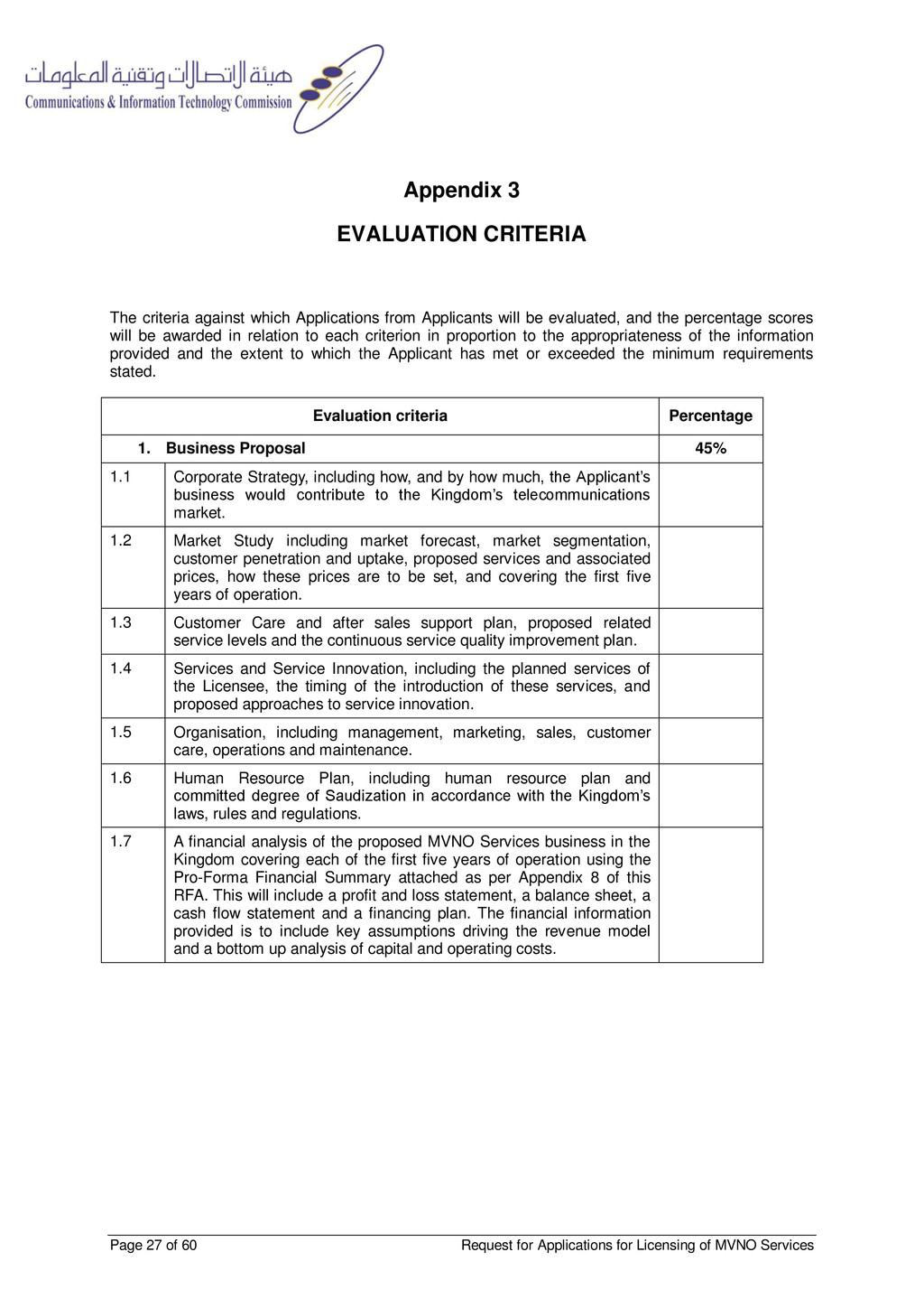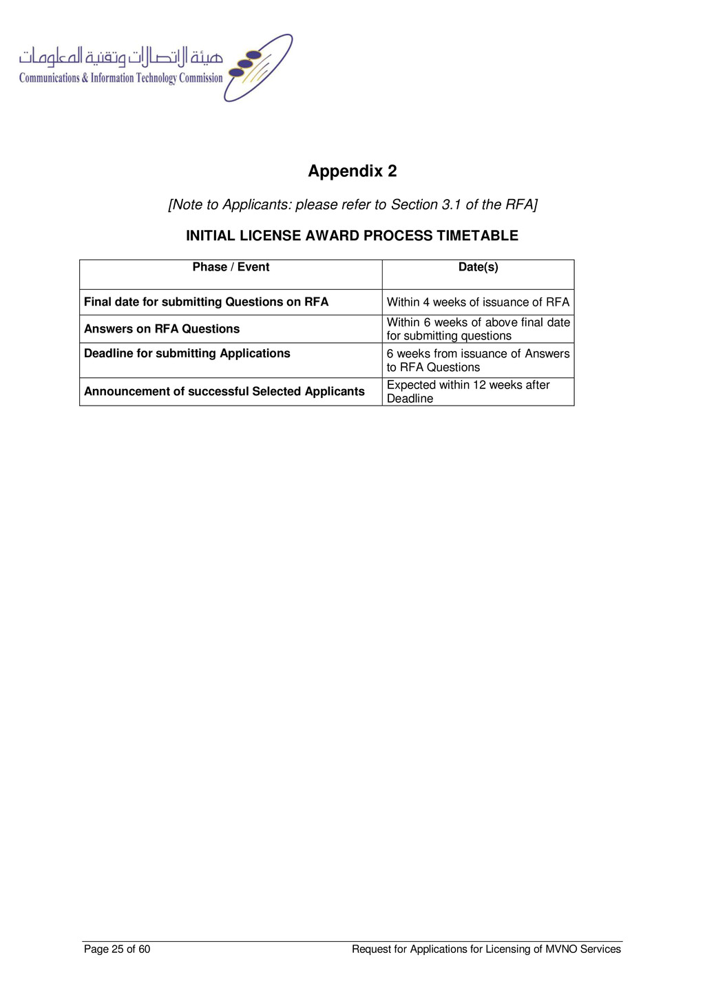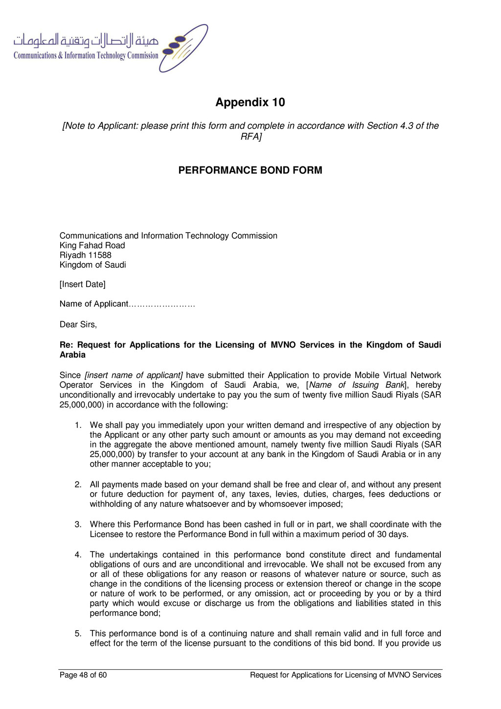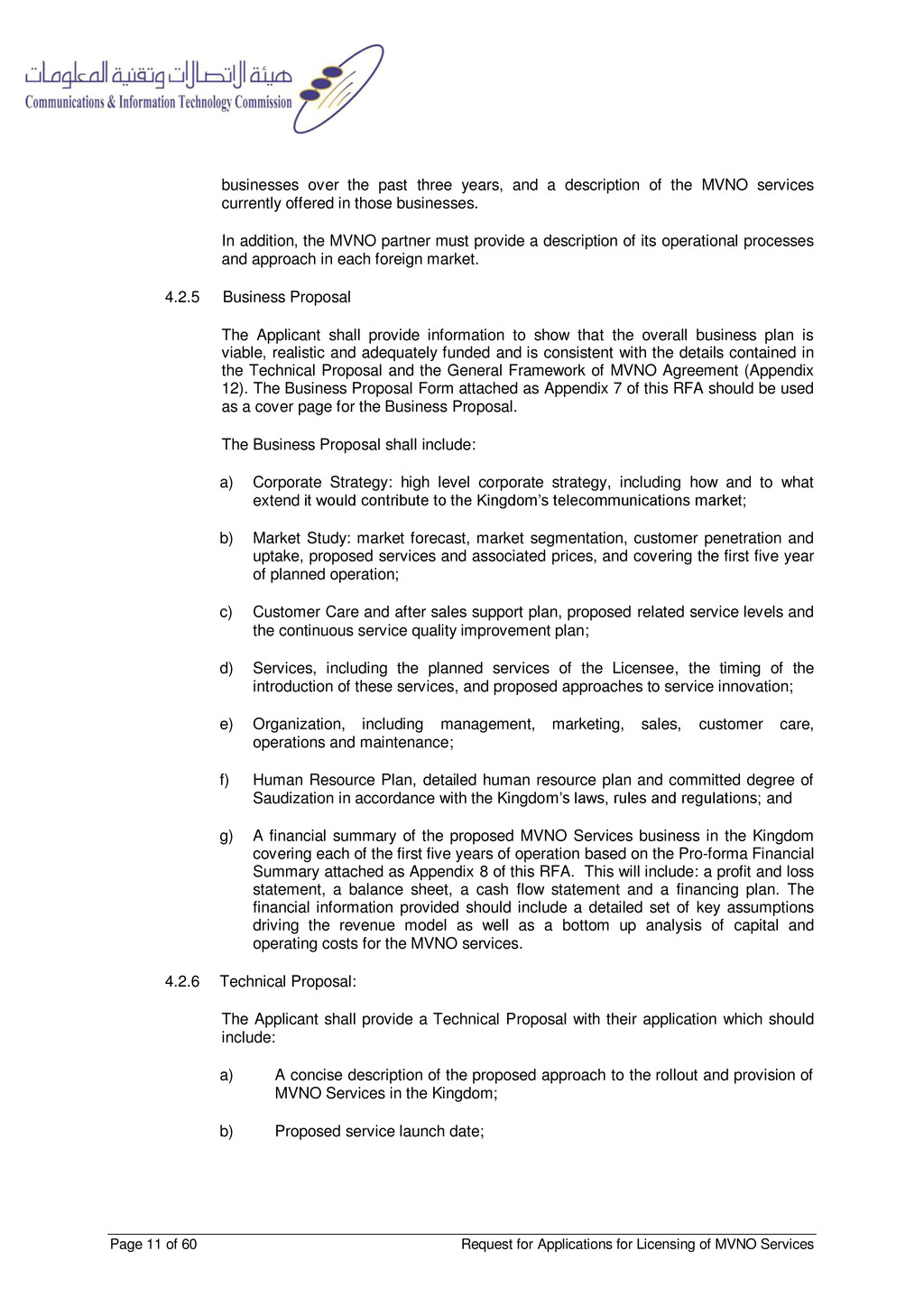 MVNO Services to applicable copyright rules and regulations of the KSA. The information contained in this RFA or subsequently provided to Applicants, whether orally or in documentary form by or on behalf of CITC or any of its employees or Advisors, is provided to Applicants on the terms and conditions set out in this document. 6.5.2 This RFA is not an agreement and does not constitute an offer by CITC to any other party. This RFA does not purport to contain all the information each Applicant may require. It is not the role of CITC, its employees or Advisors to consider the investment objectives, financial situation and particular needs of each Applicant who obtains this RFA. CITC has made reasonable efforts to include accurate and current information in this RFA and in any other documentation provided to Applicants. However, no representation or warranty, expressed or implied, is made by CITC or its employees or by any of its Advisors as to the accuracy, reliability or completeness of the information provided and neither CITC and its employees nor any of its Advisors shall have any liability whatsoever to any Applicants or, where applicable, to any of their Consortium members, owners or shareholders or any other person resulting from use of or reliance on any of the information so provided. Each Applicant should conduct its own investigations and analysis and should check the accuracy, reliability and completeness of the information set out in this RFA and obtain independent advice from appropriate sources prior to use of or reliance on that information. 6.5.3 Notwithstanding any other provisions in this RFA, for whatever reason and without incurring any costs or liabilities or any obligation to inform the Applicants of the reasons for its actions, CITC reserves the absolute and unfettered right, in its sole discretion: a) To take any action, including amending, updating and supplementing this RFA and any other CITC documents, which it considers necessary to ensure that the licensing process occurs in a fair, open and transparent manner, in accordance with the laws of the Kingdom and so as to meet the objectives of CITC; b) To modify the licensing process set out in this RFA and any other CITC documents; c) To accept or reject any Application and to waive any minor informalities or defects in Applications received; d) To reject any Applicant or Application which CITC reasonably believes may pose a risk to national security, safety or scarce resources or which, following the award of a license, may lead to an anti-competitive environment in the market for public telecommunications services in the Kingdom; e) To annul, postpone and/or terminate the licensing process or revoke an award of License at any time before the License is actually issued without any liability on CITC; and f) To accept or not accept any one or more Applicants who have filed an Application. 6.5.4 CITC is not legally obliged to select any Applicant as a Successful Applicant, or to issue a License to any Applicant. 6.5.5 Neither the Government of the KSA nor any of its agencies, employees, representatives, advisors or consultants, including CITC and its Advisors, shall incur any liability whatsoever to any Applicant or, where applicable, to any of its owners or shareholders or any other person by reason of any Decision made or action taken by