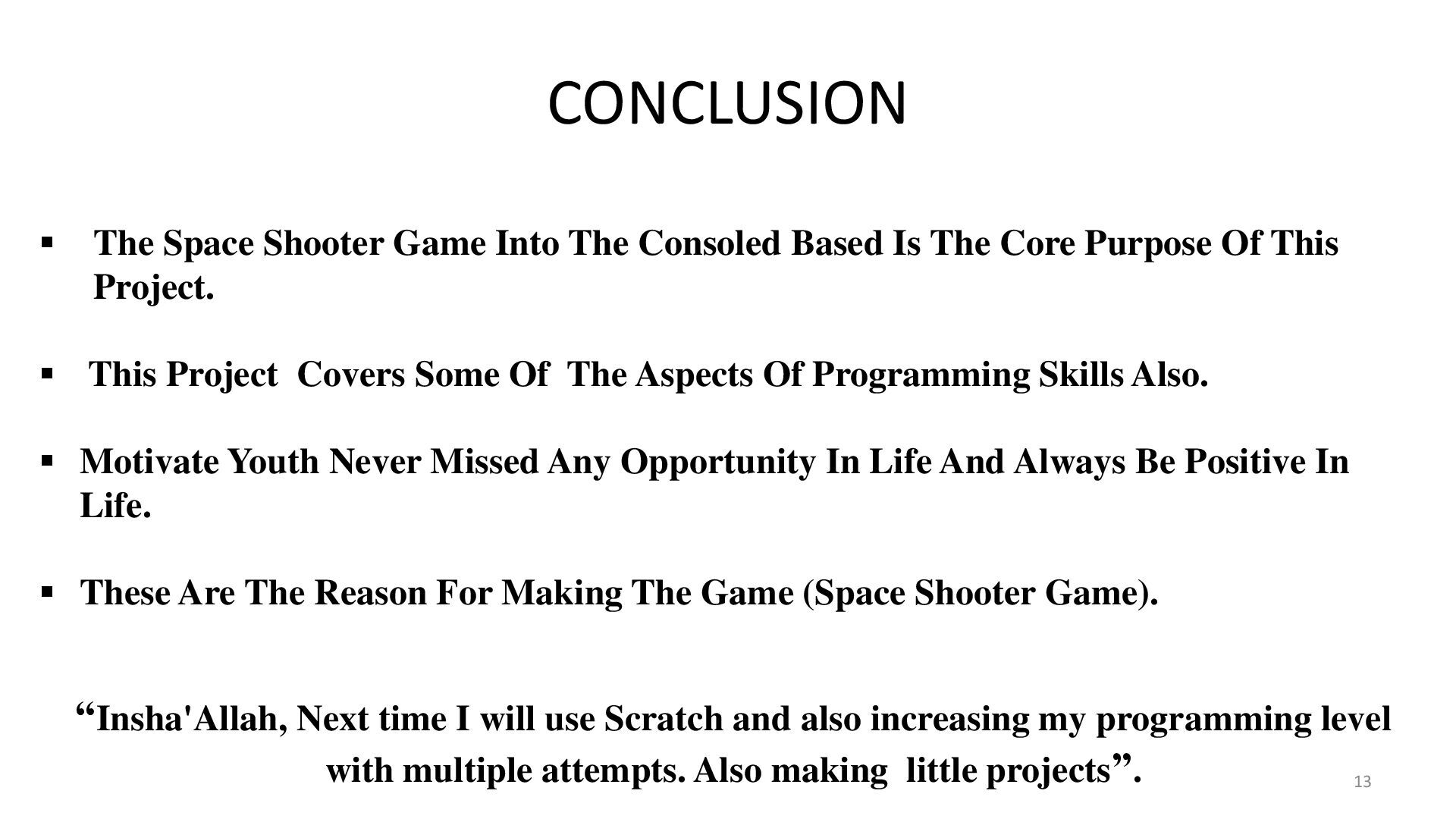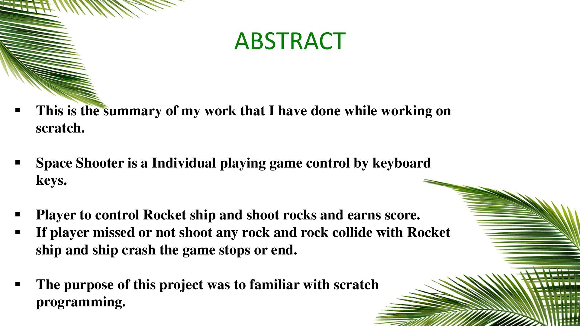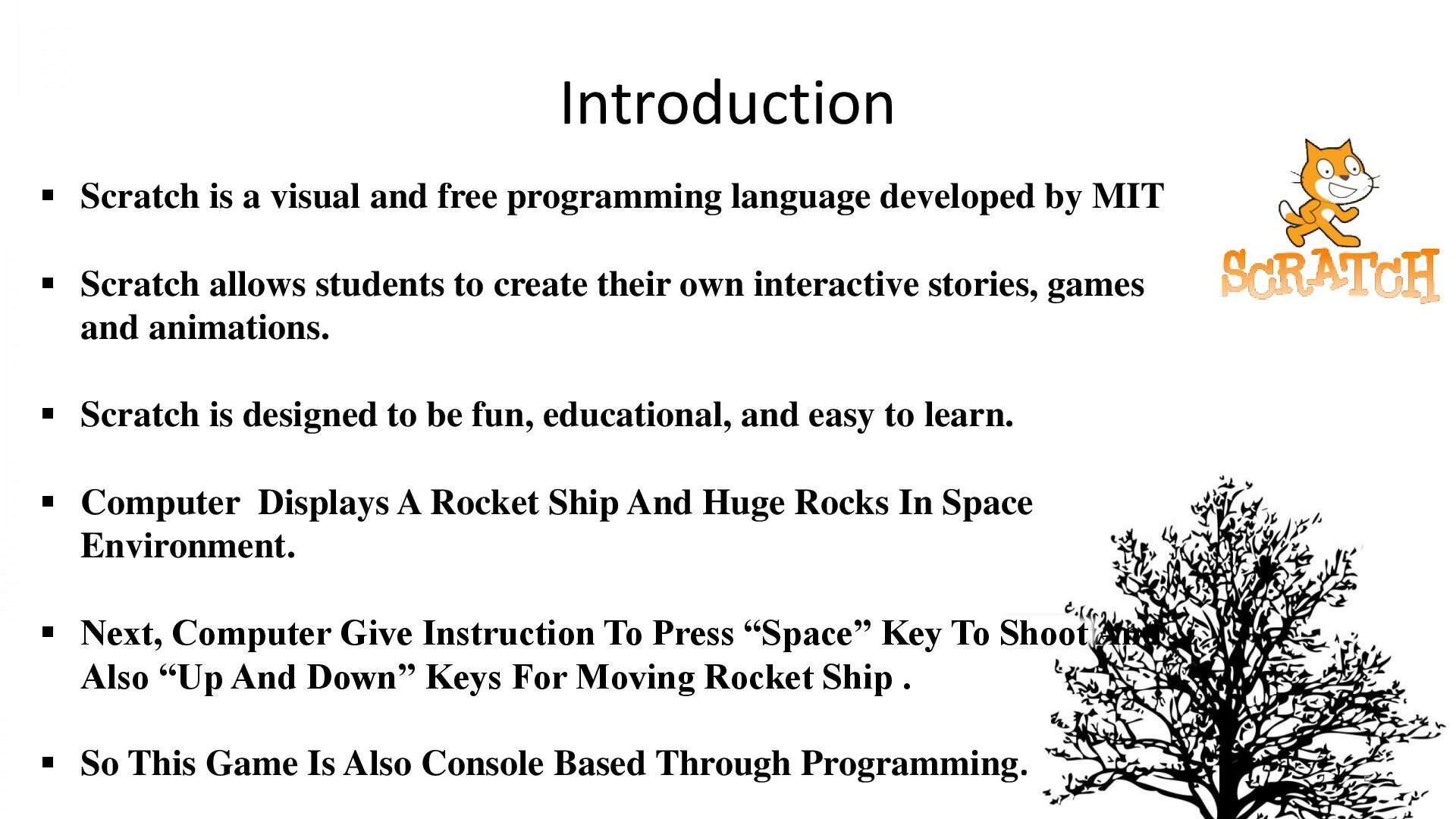 language developed by MIT ▪ Scratch allows students to create their own interactive stories, games and animations. ▪ Scratch is designed to be fun, educational, and easy to learn. ▪ Computer Displays A Rocket Ship And Huge Rocks In Space Environment. ▪ Next, Computer Give Instruction To Press “Space” Key To Shoot And Also “Up And Down” Keys For Moving Rocket Ship . ▪ So This Game Is Also Console Based Through Programming.
