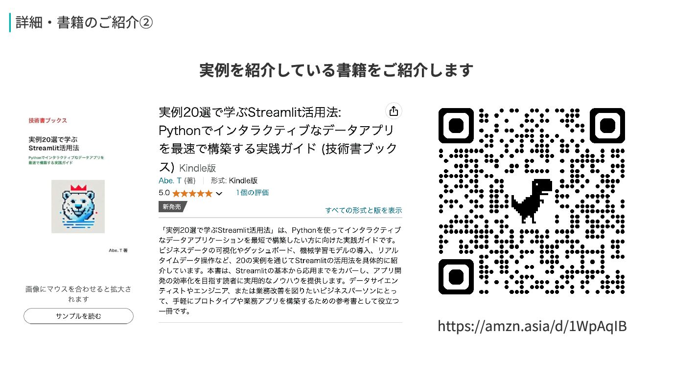 複数の部門で簡単に共有できる プラットフォームとして、デー タの一貫性を保ちながら情報を 活用し、全社的な意思決定支援 が可能です。 全社で共有可能 Streamlitを活用することで、専 門的な開発スキルがなくても、 素早くデータを視覚化し、容易 に操作可能なアプリケーション