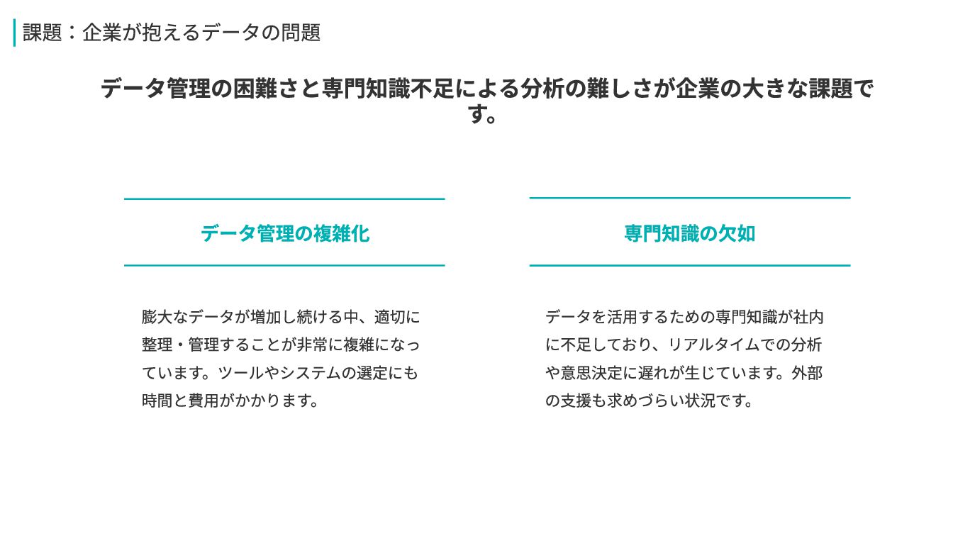 データ管理の困難さと専門知識不足による分析の難しさが企業の大きな課題で す。 専門知識の欠如 データを活用するための専門知識が社内 に不足しており、リアルタイムでの分析 や意思決定に遅れが生じています。外部 の支援も求めづらい状況です。 データ管理の複雑化 膨大なデータが増加し続ける中、適切に 整理・管理することが非常に複雑になっ