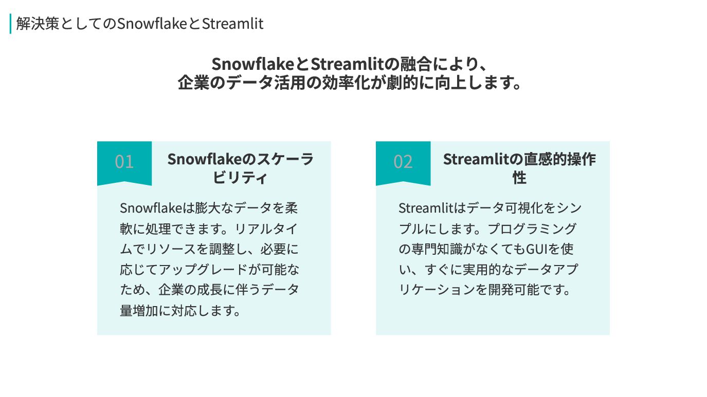 企業のデータ活用の効率化が劇的に向上します。 03 02 Streamlitの直感的操作 性 Streamlitはデータ可視化をシン プルにします。プログラミング の専門知識がなくてもGUIを使 い、すぐに実用的なデータアプ リケーションを開発可能です。 解決策としてのSnowflakeとStreamlit