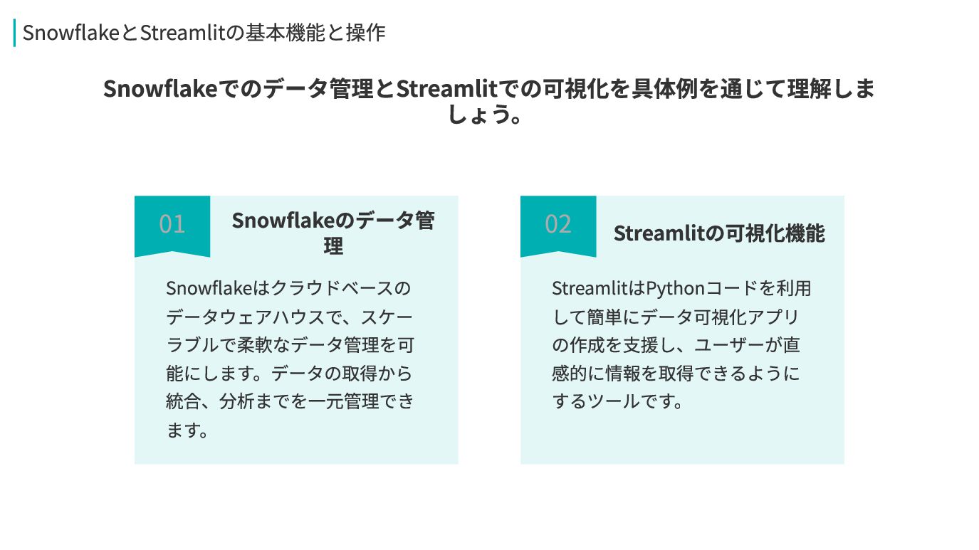 しょう。 03 02 Streamlitの可視化機能 StreamlitはPythonコードを利用 して簡単にデータ可視化アプリ の作成を支援し、ユーザーが直 感的に情報を取得できるように するツールです。 SnowflakeとStreamlitの基本機能と操作