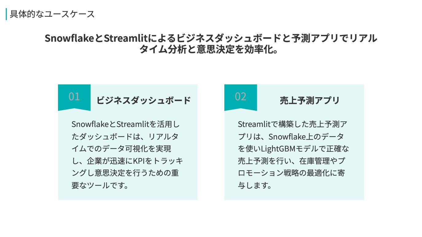 03 02 売上予測アプリ Streamlitで構築した売上予測ア プリは、Snowflake上のデータ を使いLightGBMモデルで正確な 売上予測を行い、在庫管理やプ ロモーション戦略の最適化に寄 与します。 具体的なユースケース