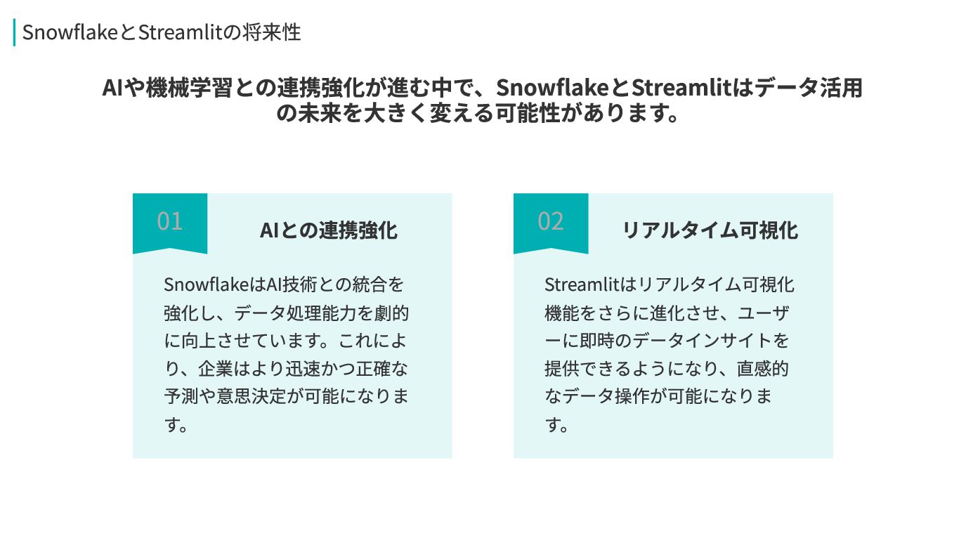 01 AIとの連携強化 SnowflakeはAI技術との統合を 強化し、データ処理能力を劇的 に向上させています。これによ り、企業はより迅速かつ正確な 予測や意思決定が可能になりま す。 AIや機械学習との連携強化が進む中で、SnowflakeとStreamlitはデータ活用 の未来を大きく変える可能性があります。