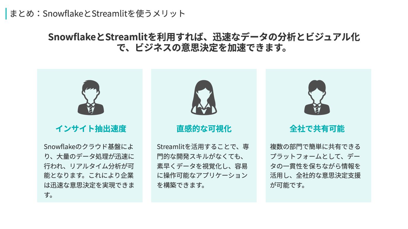 を構築できます。 直感的な可視化 Snowflakeのクラウド基盤によ り、大量のデータ処理が迅速に 行われ、リアルタイム分析が可 能となります。これにより企業 は迅速な意思決定を実現できま す。 インサイト抽出速度 SnowflakeとStreamlitを利用すれば、迅速なデータの分析とビジュアル化 で、ビジネスの意思決定を加速できます。 まとめ:SnowflakeとStreamlitを使うメリット