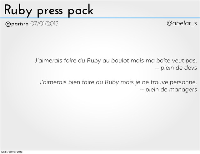 avec JRuby ‣ difficile à héberger ‣ toutes les plateformes du marché ont fait un effort sur Ruby ‣ au pire JRuby le met à dispo partout ‣ manque de libs ou de best practices lundi 7 janvier 2013