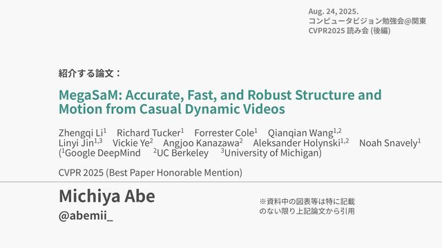 Jin, Vickie Ye, Angjoo Kanazawa, Aleksander Holynski, Noah Snavely. MegaSaM: Accurate, Fast, and Robust Structure and Motion from Casual Dynamic Videos. CVPR, 2025. Z. Teed, J. Deng. DROID-SLAM: Deep Visual SLAM for Monocular, Stereo, and RGB-D Cameras. NeurIPS, 2021. Zhoutong Zhang, Forrester Cole, Zhengqi Li, Noah Snavely, Michael Rubinstein, and William T. Freeman. Structure and Motion from Casual Videos. ECCV, 2022. Junyi Zhang, Charles Herrmann, Junhwa Hur, Varun Jampani, Trevor Darrell, Forrester Cole, Deqing Sun, Ming-Hsuan Yang. MonST3R: A Simple Approach for Estimating Geometry in the Presence of Motion. ICLR, 2025. Hexuan Dou, Xinyang Zhao, Bo Liu, Yinghao Jia, Guoqing Wang, Changhong Wang. Enhancing Real-Time Visual SLAM with Distant Landmarks in Large-Scale Environments. Drones. 2024. D. J. Butler, J. Wulff, G. B. Stanley, M. J. Black. A naturalistic open source movie for optical flow evaluation. ECCV, 2012. Hang Gao, Ruilong Li, Shubham Tulsiani, Bryan Russell, Angjoo Kanazawa. Monocular dynamic view synthesis: A reality check. NeurIPS, 2022. Zhengqi Li, Qianqian Wang, Forrester Cole, Richard Tucker, Noah Snavely. DynIBaR: Neural Dynamic Image-Based Rendering. CVPR, 2023. Lihe Yang, Bingyi Kang, Zilong Huang, Xiaogang Xu, Jiashi Feng, and Hengshuang Zhao. Depth anything: Unleashing the power of large-scale unlabeled data. In CVPR, 2024 Luigi Piccinelli, Yung-Hsu Yang, Christos Sakaridis, Mattia Segu, Siyuan Li, Luc Van Gool, and Fisher Yu. UniDepth: Universal monocular metric depth estimation. In CVPR, 2024. 参考⽂献
