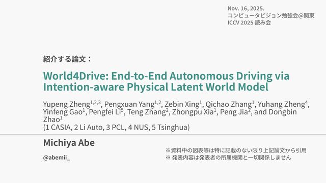 Yuhang Zheng, Yinfeng Gao, Pengfei Li, Teng Zhang, Zhongpu Xia, Peng Jia, Dongbin Zhao. World4Drive: End-to-End Autonomous Driving via Intention-aware Physical Latent World Model. In ICCV, 2025. • Yihan Hu, Jiazhi Yang, Li Chen, Keyu Li, Chonghao Sima, Xizhou Zhu, Siqi Chai, Senyao Du, Tianwei Lin, Wenhai Wang, Lewei Lu, Xiaosong Jia, Qiang Liu, Jifeng Dai, Yu Qiao, Hongyang Li. Planning-oriented Autonomous Driving. In CVPR, 2023. • Mu Hu, Wei Yin, Chi Zhang, Zhipeng Cai, Xiaoxiao Long, Hao Chen, Kaixuan Wang, Gang Yu, Chunhua Shen, and Shaojie Shen. Metric3d v2: A versatile monocular geometric foundation model for zero-shot metric depth and surface normal estimation. IEEE Transactions on Pattern Analysis and Machine Intelligence, 2024. • Tianhe Ren, Shilong Liu, Ailing Zeng, Jing Lin, Kunchang Li, He Cao, Jiayu Chen, Xinyu Huang, Yukang Chen, Feng Yan, et al. Grounded sam: Assembling open-world models for diverse visual tasks. arXiv preprint arXiv:2401.14159, 2024. • Shenyuan Gao, Jiazhi Yang, Li Chen, Kashyap Chitta, Yihang Qiu, Andreas Geiger, Jun Zhang, and Hongyang Li. Vista: A generalizable driving world model with high fidelity and versatile controllability. arXiv preprint arXiv:2405.17398, 2024. • Anthony Hu, Lloyd Russell, Hudson Yeo, Zak Murez, George Fedoseev, Alex Kendall, Jamie Shotton, and Gianluca Corrado. Gaia-1: A generative world model for autonomous driving. arXiv preprint arXiv:2309.17080, 2023a. • Yingyan Li, Lue Fan, Jiawei He, Yuqi Wang, Yuntao Chen, Zhaoxiang Zhang, Tieniu Tan. Enhancing End-to-End Autonomous Driving with Latent World Model. ICLR, 2025. 参考⽂献