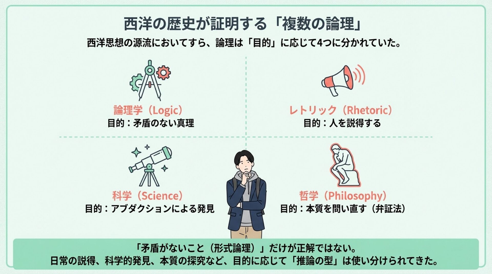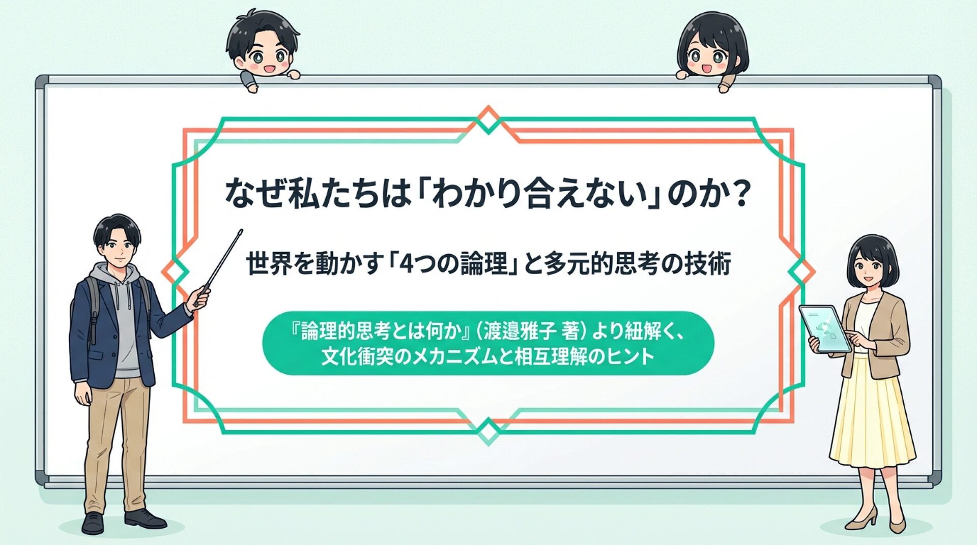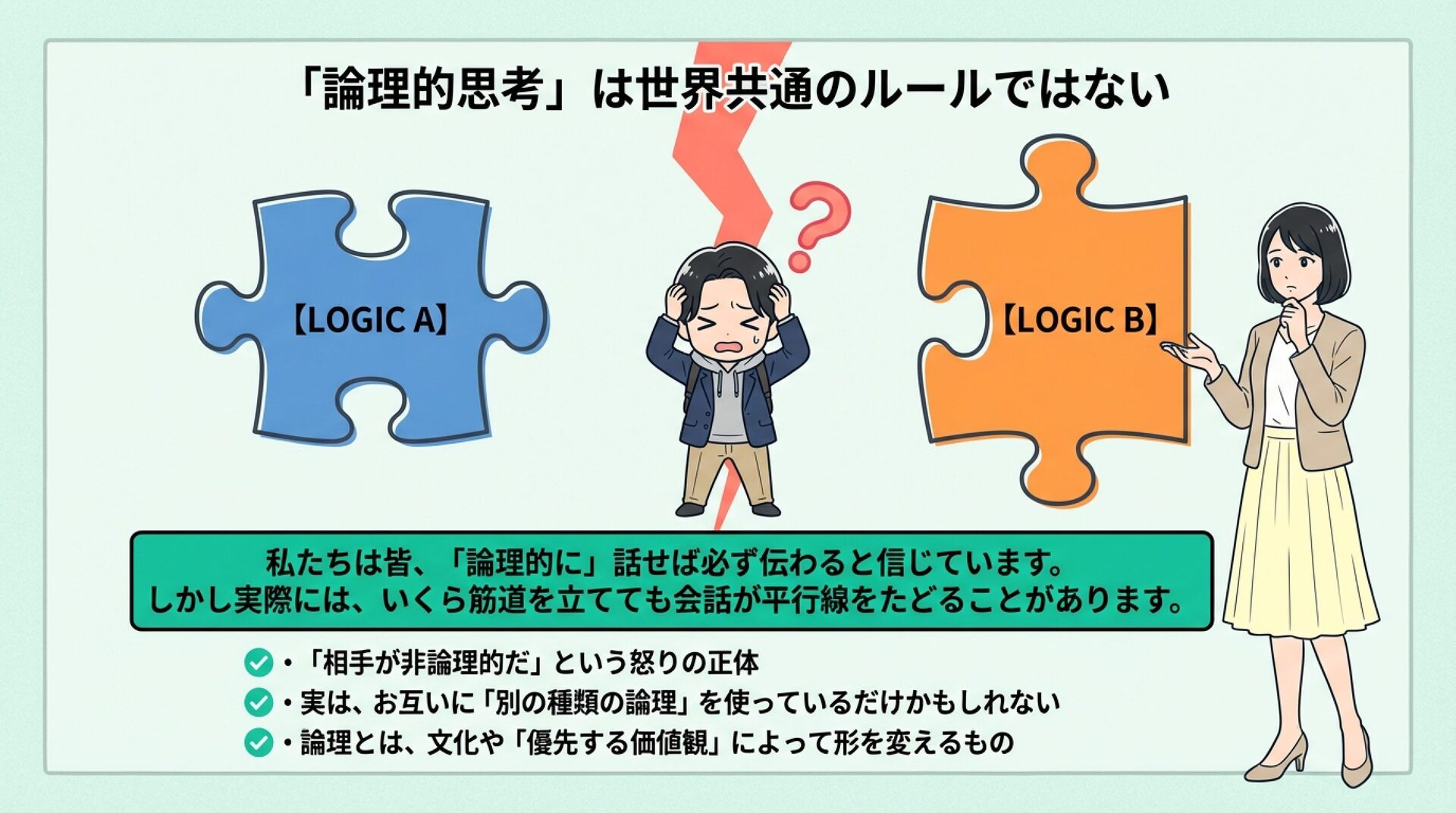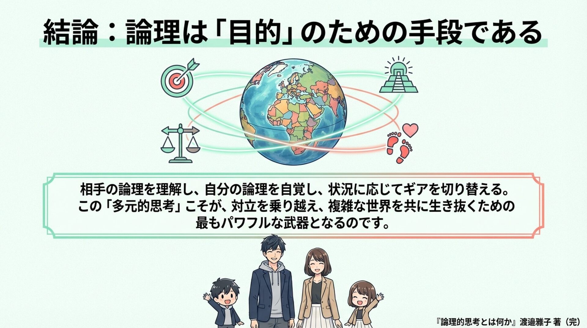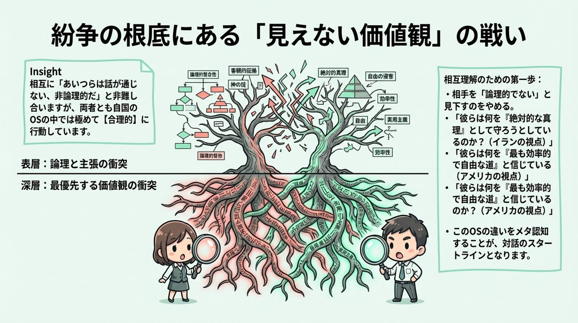 NotebookLMで生成。 『論理的思考とは何か』(渡邊雅子著)を手がかりに、「論理」は世界共通の一つの正解ではなく、文化や社会の価値観によって形を変えるという視点を整理した資料です。アメリカ・フランス・イラン・日本を例に、世界を動かす「4つの論理」を比較し、なぜ人は分かり合えず、対立や衝突が起きるのかを考察しました。戦争や国際対立の背景にある“見えない価値観の衝突”を読み解き、多元的思考の重要性を考える内容にしました。