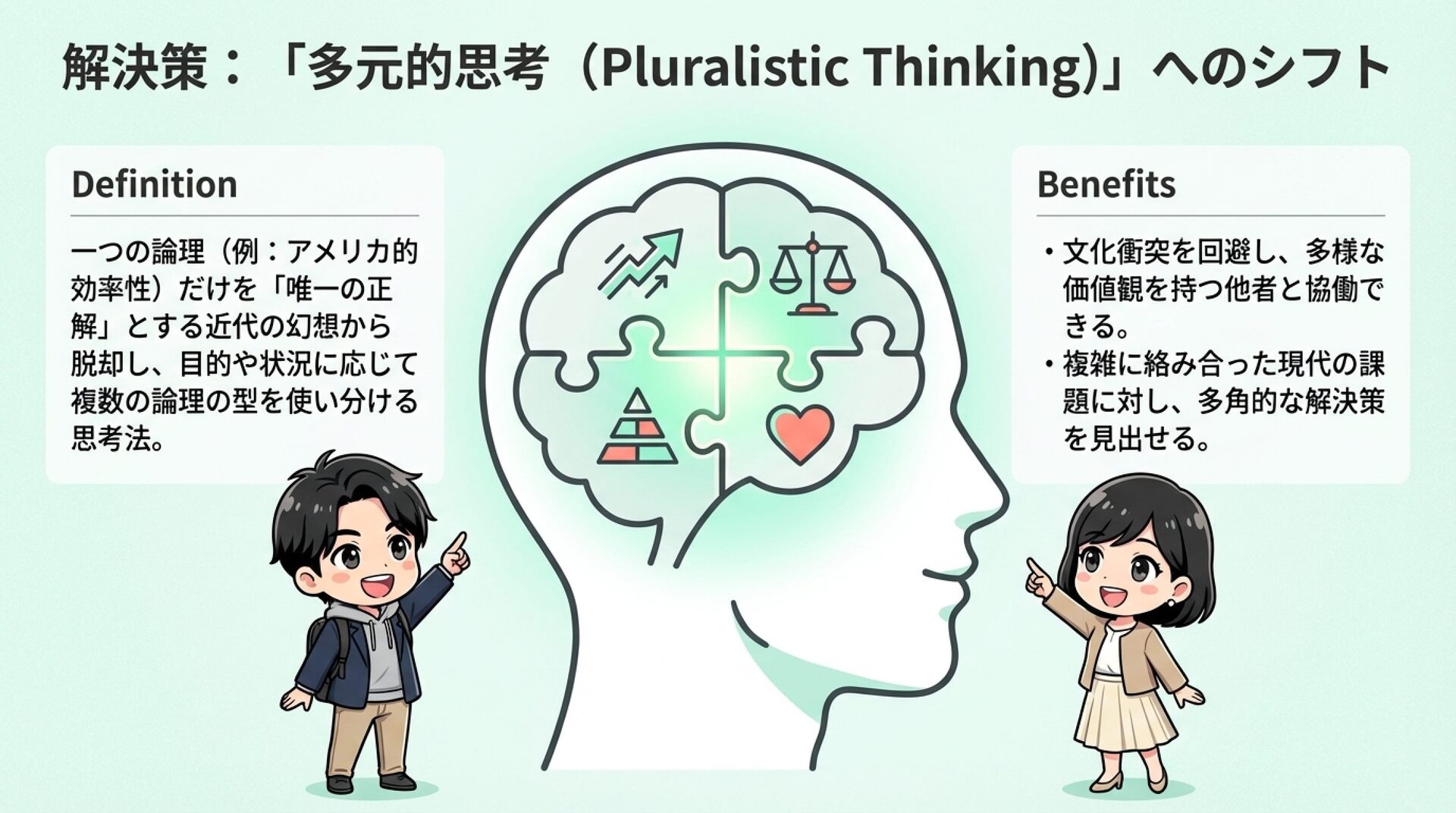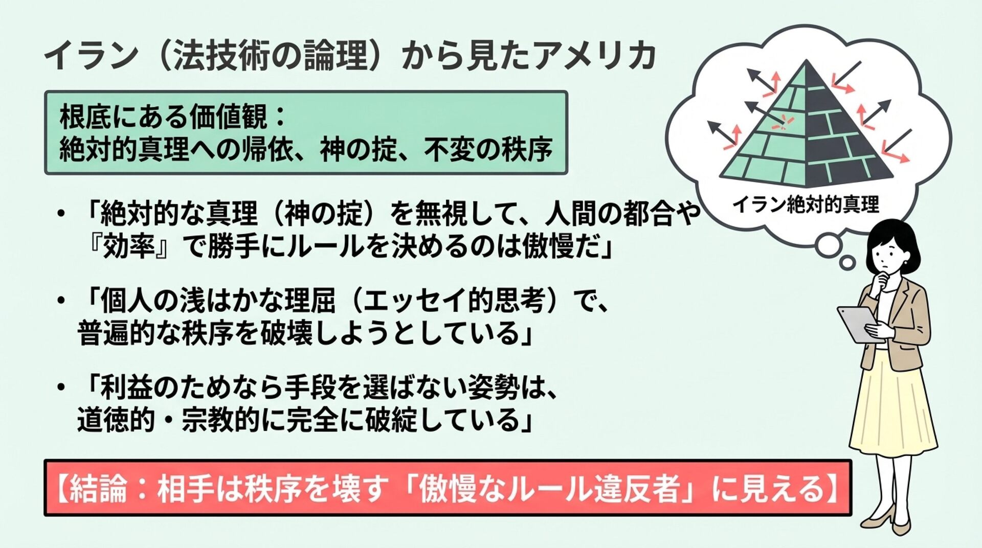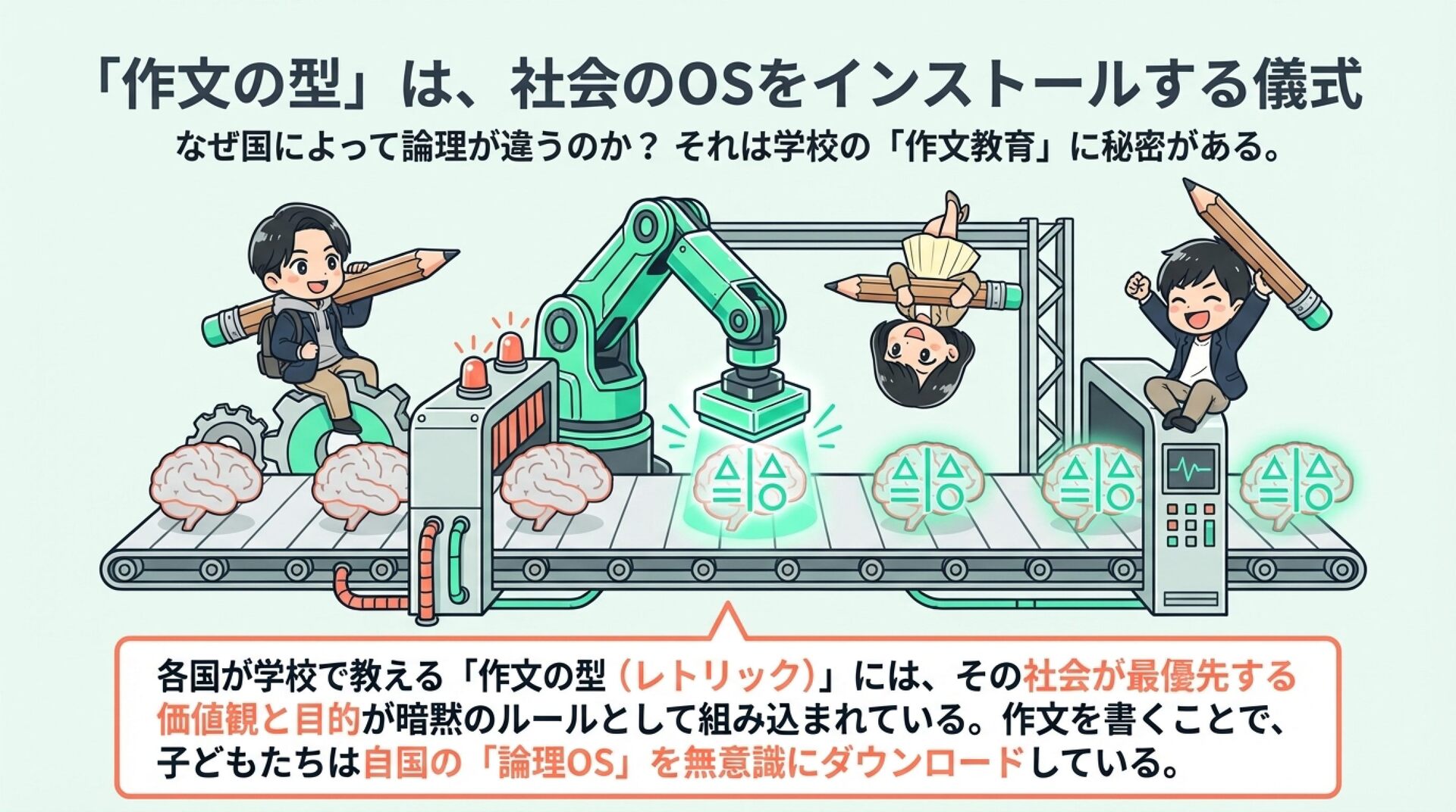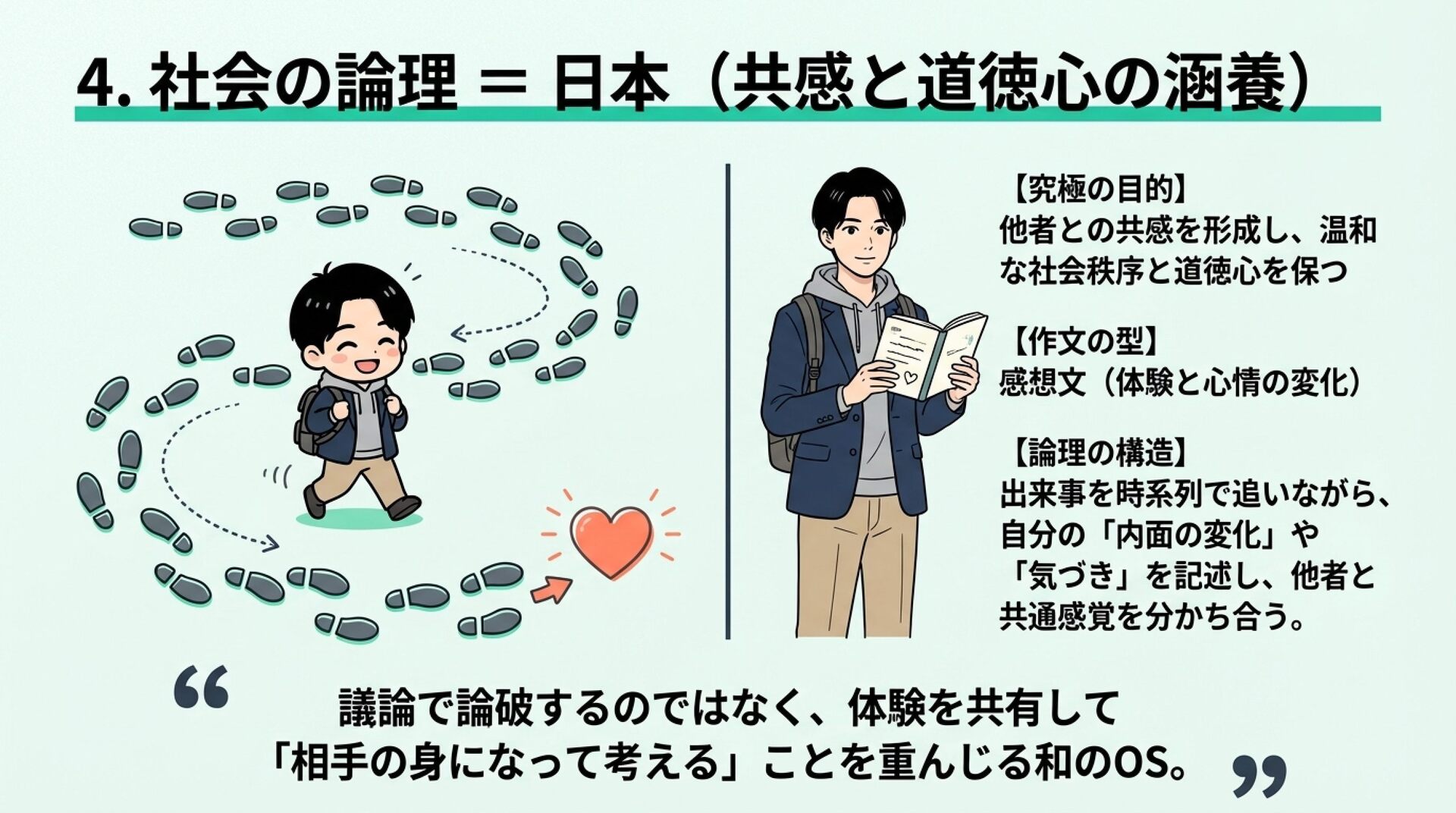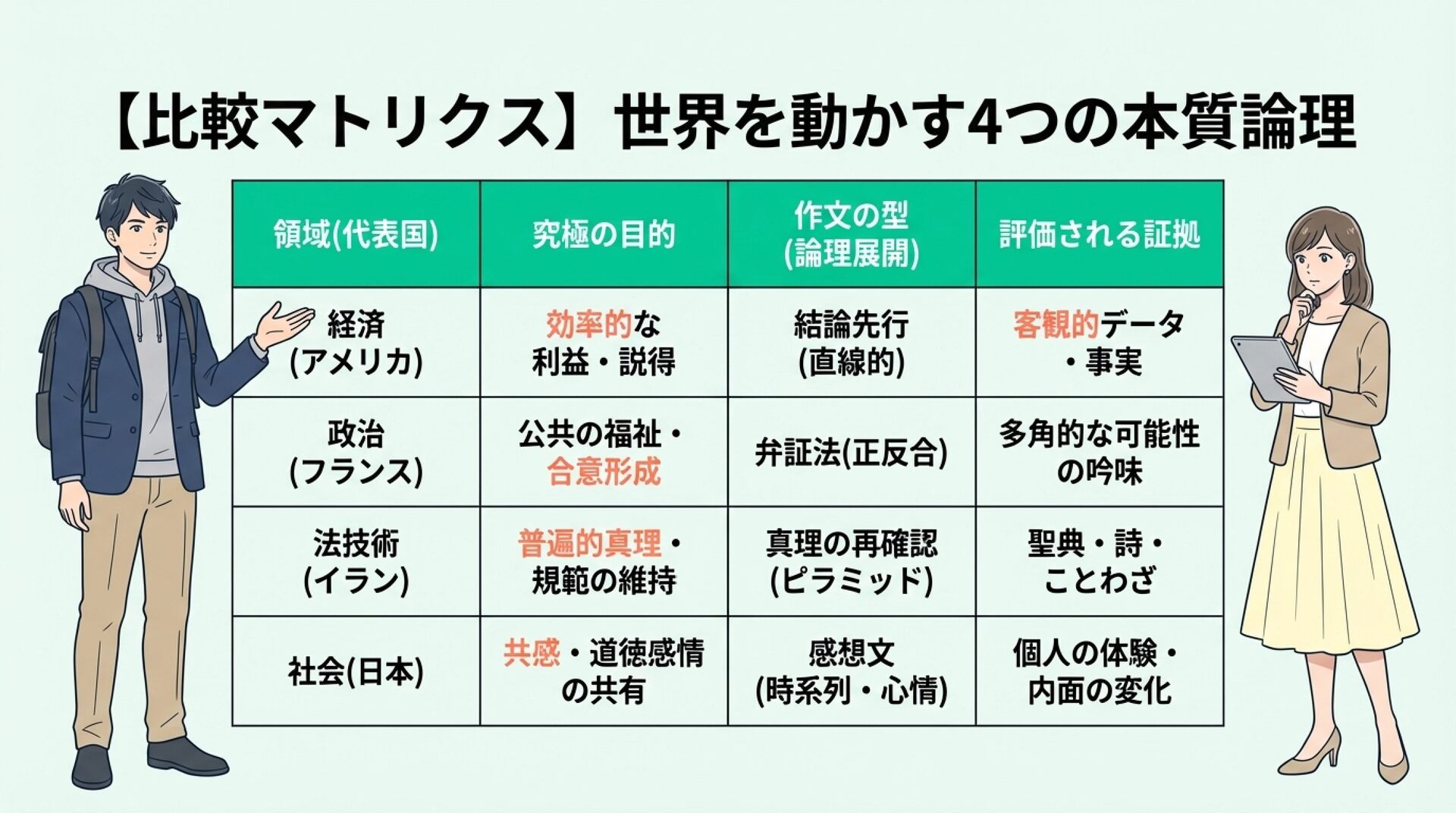 NotebookLMで生成。 『論理的思考とは何か』(渡邊雅子著)を手がかりに、「論理」は世界共通の一つの正解ではなく、文化や社会の価値観によって形を変えるという視点を整理した資料です。アメリカ・フランス・イラン・日本を例に、世界を動かす「4つの論理」を比較し、なぜ人は分かり合えず、対立や衝突が起きるのかを考察しました。戦争や国際対立の背景にある“見えない価値観の衝突”を読み解き、多元的思考の重要性を考える内容にしました。