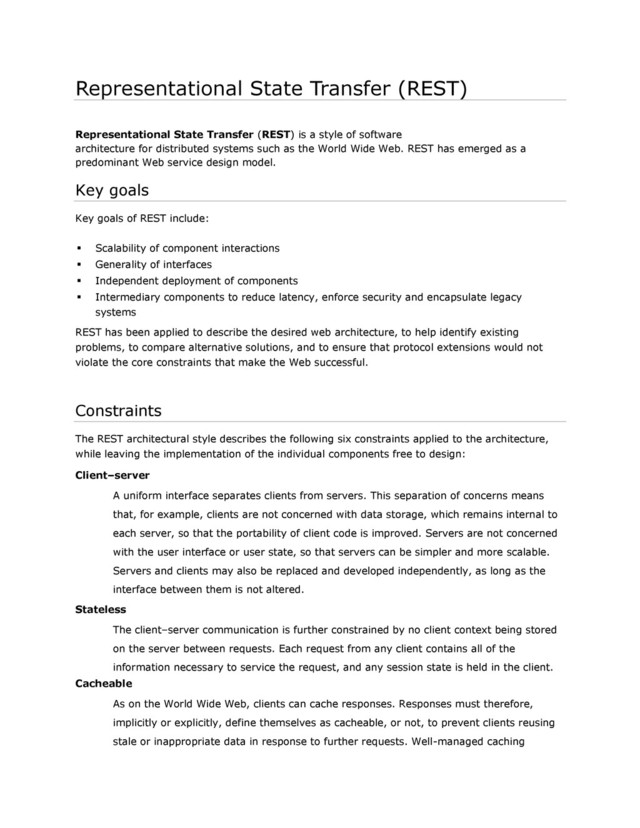 and performance. Layered system A client cannot ordinarily tell whether it is connected directly to the end server, or to an intermediary along the way. Intermediary servers may improve system scalability by enabling load-balancing and by providing shared caches. They may also enforce security policies. Code on demand (optional) Servers are able temporarily to extend or customize the functionality of a client by the transfer of executable code. Examples of this may include compiled components such as Java applets and client-side scripts such as JavaScript. Uniform interface The uniform interface between clients and servers, discussed below, simplifies and decouples the architecture, which enables each part to evolve independently. The four guiding principles of this interface are detailed below. The only optional constraint of REST architecture is code on demand. If a service violates any other constraint, it cannot strictly be considered RESTful. Central principle An important concept in REST is the existence of resources (sources of specific information), each of which is referenced with a global identifier (e.g., a URI in HTTP). In order to manipulate these resources, components of the network (user agents and origin servers) communicate via a standardized interface (e.g., HTTP) and exchange representations of these resources (the actual documents conveying the information). For example, a resource that represents a circle (as a logical object) may accept and return a representation that specifies a center point and radius, formatted in SVG, but may also accept and return a representation that specifies any three distinct points along the curve (since this also uniquely identifies a circle) as a comma-separated list. Any number of connectors (e.g., clients, servers, caches, tunnels, etc.) can mediate the request, but each does so without "seeing past" its own request (referred to as "layering," another constraint of REST and a common principle in many other parts of information and networking architecture). Thus, an application can interact with a resource by knowing two things: the identifier of the resource and the action required—it does not need to know whether there are caches, proxies, gateways, firewalls, tunnels, or anything else between it and the server actually holding the information. The application does, however, need to understand the format of the information (representation) returned, which is typically an HTML, XML or JSON document of some kind, although it may be an image, plain text, or any other content.