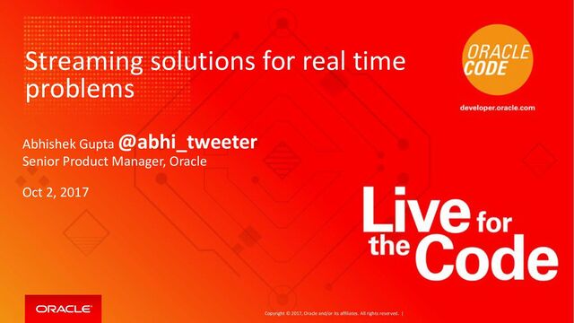 | Before we dive in… • Goal – Using a practical example, familiarize you with a tech stack for dealing with fast/real time/streaming data • Agenda – 101s - Kafka, Kafka Streams & Redis – Sample app & implementation (using Oracle Cloud) – Q & A • Content – Slideshare – Github