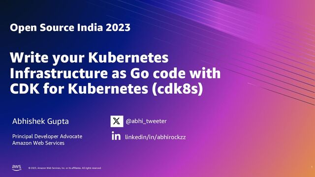 rights reserved. © 2023, Amazon Web Services, Inc. or its affiliates. All rights reserved. Cloud Development Kit (CDK) for Kubernetes (cdk8s) An open-source multi-language framework for modeling Kubernetes resources as reusable components Go from code to config Define Kubernetes applications and architectures using familiar programming languages Cut, copy & paste Turn best practices into code libraries and share easily Run everywhere cdk8s runs locally and generates YAML you can deploy to any cluster, anywhere Java