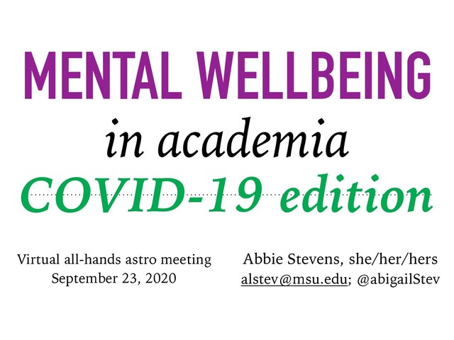 in crisis: science cannot risk losing the next generation” (Nature editorial, Sept 2020) ➤ “Pandemic darkens postdocs’ work and career hopes” (Nature career feature, Sept 2020) ➤ Out of 7,670 int’l postdocs surveyed: ➤ 61% think the pandemic has worsened their career prospects, another 25% aren’t sure if it has or not ➤ 23% have sought help for anxiety or depression caused by work, another 26% would like to seek help ➤ 51% are considering leaving academia because of work- related mental health concerns