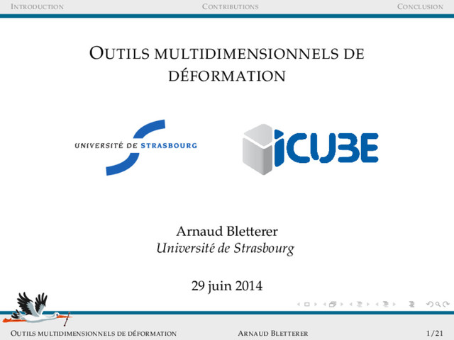 sous-ensemble de points de l’espace M´ elanger plusieurs outils sur un mˆ eme objet Fils directeurs Minimisation des temps de calcul Formulations math´ ematiques simples et claires OUTILS MULTIDIMENSIONNELS DE D ´ EFORMATION ARNAUD BLETTERER 8/21
