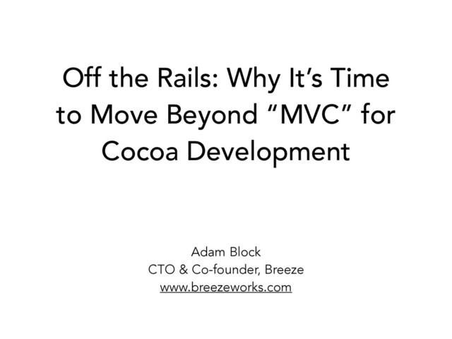 VCs from business logic, formatters, validation, storage, and complex view hierarchies • Use a ViewModel or Presenter to represent the state of your UI abstracted from view code • Bindings simplify links between layers, but aren’t the only way that works • Experiment to figure out what works best for your team