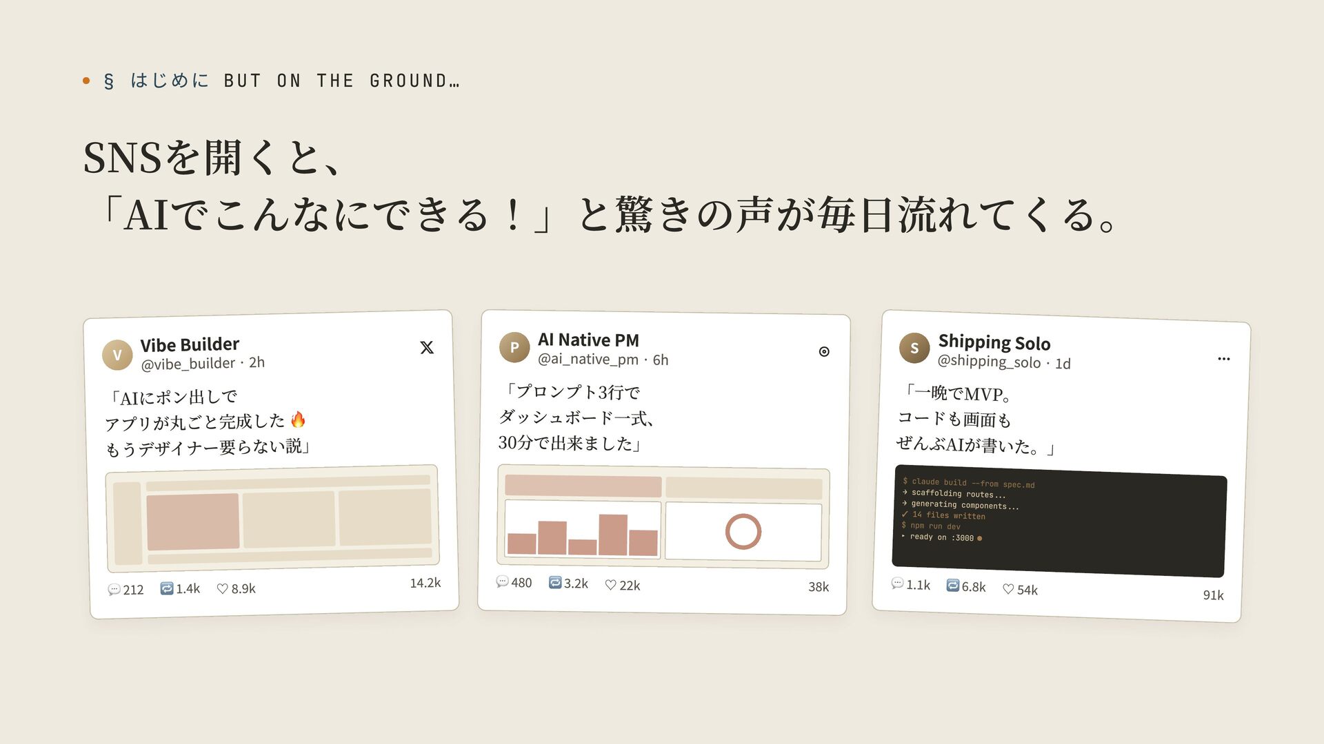 6h AI Native PM Vibe Builder @vibe_builder · 2h @shipping_solo · 1d Shipping Solo P S V 30分で出来ました」 ダッシュボード一式、 「プロンプト3行で ぜんぶAIが書いた。」 コードも画面も 「一晩でMVP。 「AIにポン出しで アプリが丸ごと完成した 🔥 もうデザイナー要らない説」 ▸ ready on :3000 $ npm run dev ✓ 14 files written → generating components... → scaffolding routes... $ claude build --from spec.md • 💬 480 🔁 3.2k ♡ 22k 14.2k 💬 1.1k 🔁 6.8k ♡ 54k 38k 💬 212 🔁 1.4k ♡ 8.9k 91k