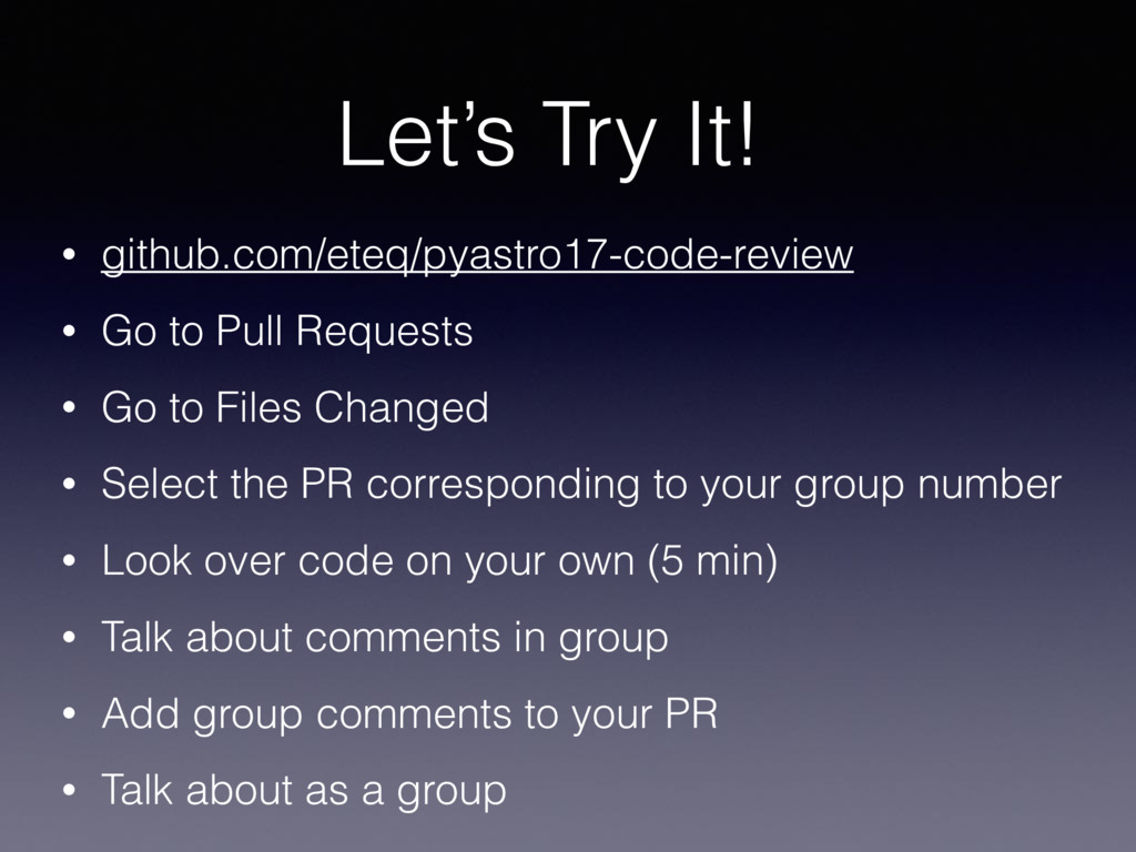 • Go to Files Changed • Select the PR corresponding to your group number • Look over code on your own (5 min) • Talk about comments in group • Add group comments to your PR • Talk about as a group