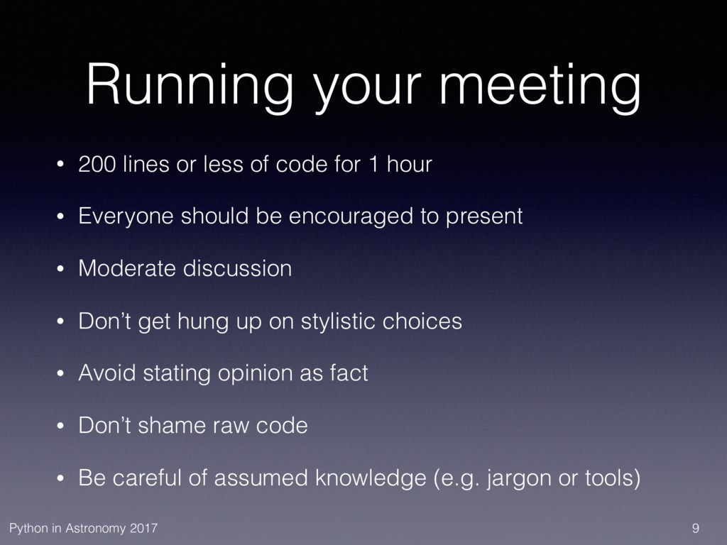 or less of code for 1 hour • Everyone should be encouraged to present • Moderate discussion • Don’t get hung up on stylistic choices • Avoid stating opinion as fact • Don’t shame raw code • Be careful of assumed knowledge (e.g. jargon or tools) 9