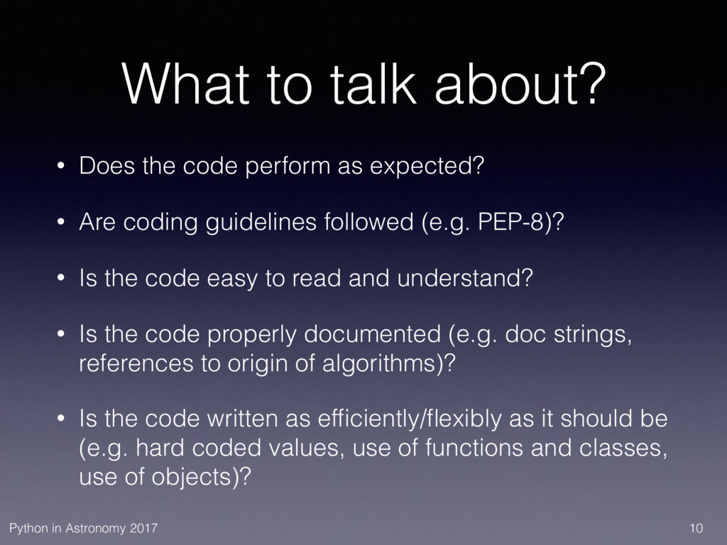 the code perform as expected? • Are coding guidelines followed (e.g. PEP-8)? • Is the code easy to read and understand? • Is the code properly documented (e.g. doc strings, references to origin of algorithms)? • Is the code written as efficiently/flexibly as it should be (e.g. hard coded values, use of functions and classes, use of objects)? 10