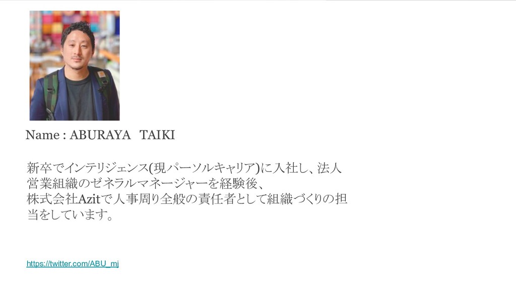 新卒でインテリジェンス(現パーソルキャリア)に入社し、法人 営業組織のゼネラルマネージャーを経験後、 株式会社Azitで人事周り全般の責任者として組織づくりの担 当をしています。 Name : ABURAYA TAIKI https://twitter.com/ABU_mj