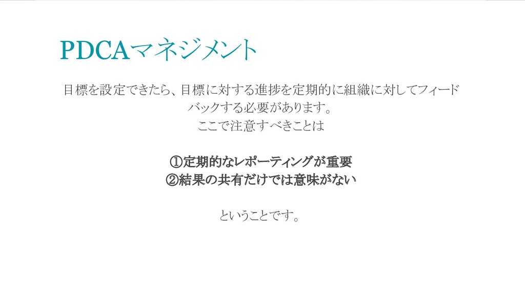 目標を設定できたら、目標に対する進捗を定期的に組織に対してフィード バックする必要があります。 ここで注意すべきことは ①定期的なレポーティングが重要 ②結果の共有だけでは意味がない ということです。 PDCAマネジメント