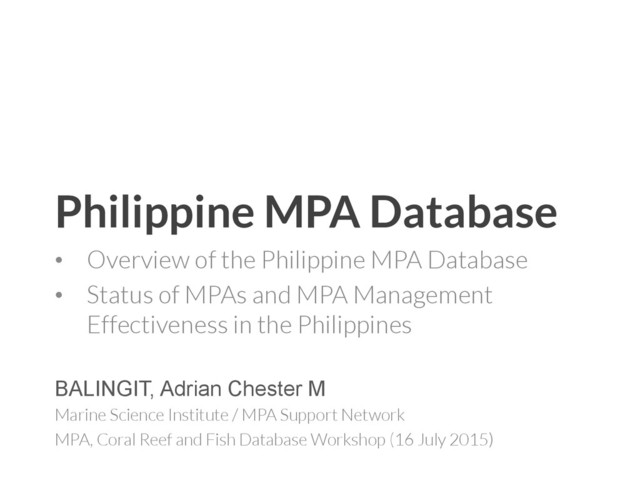 [email protected] / 09262649884 MPA Contact Persons No information available The 48 questions of the MPA MEAT can be grouped into nine (9) Management Foci, corresponding to the axes of the spider chart. The chart can show which areas of management the MPA management body is strong at and which ones need significant improvement. Management Focus Score Percentage Management Plan ............... 9/9 100% Management Body ............... 7/11 63.6% Legal Instrument ............... 5/5 100% Community Participation ............... 2/2 100% Financing ............... 9/12 75% Information, Education, and Communication ............... 7/7 100% Enforcement ............... 9/20 45% Monitoring and Evaluation ............... 12/16 75% Site Development ............... 0/2 0% Thresholds Achieved thresholds Requirements for next level Other thresholds to attain 1. Baseline assessment conducted 2. Management plan adopted 3. Legal instrument approved 4. Management body formed and roles clarified 5. Budget allocated for at least one year 6. Patrolling and surveillance conducted regularly 7. Violations documented 8. Funds generated or accessed for last 2 years 9. Regular participatory monitoring conducted 10. MPA management plan incorporated in broader development plans 11. Ecological and socioeconomic impact assessment conducted 12. IEC sustained over seven years 1. Cases filed or violators penalized 1. Enforcement system fully operational in the last five consecutive years 2. Performance monitoring of the management body conducted regularly 3. Violators prosecuted and sanctioned 4. Performance monitoring and evaluation system linked to an incentive system 5. MPA financially self-sustaining in the last seven (7) consecutive years A printable PDF report can be generated from the evaluation.