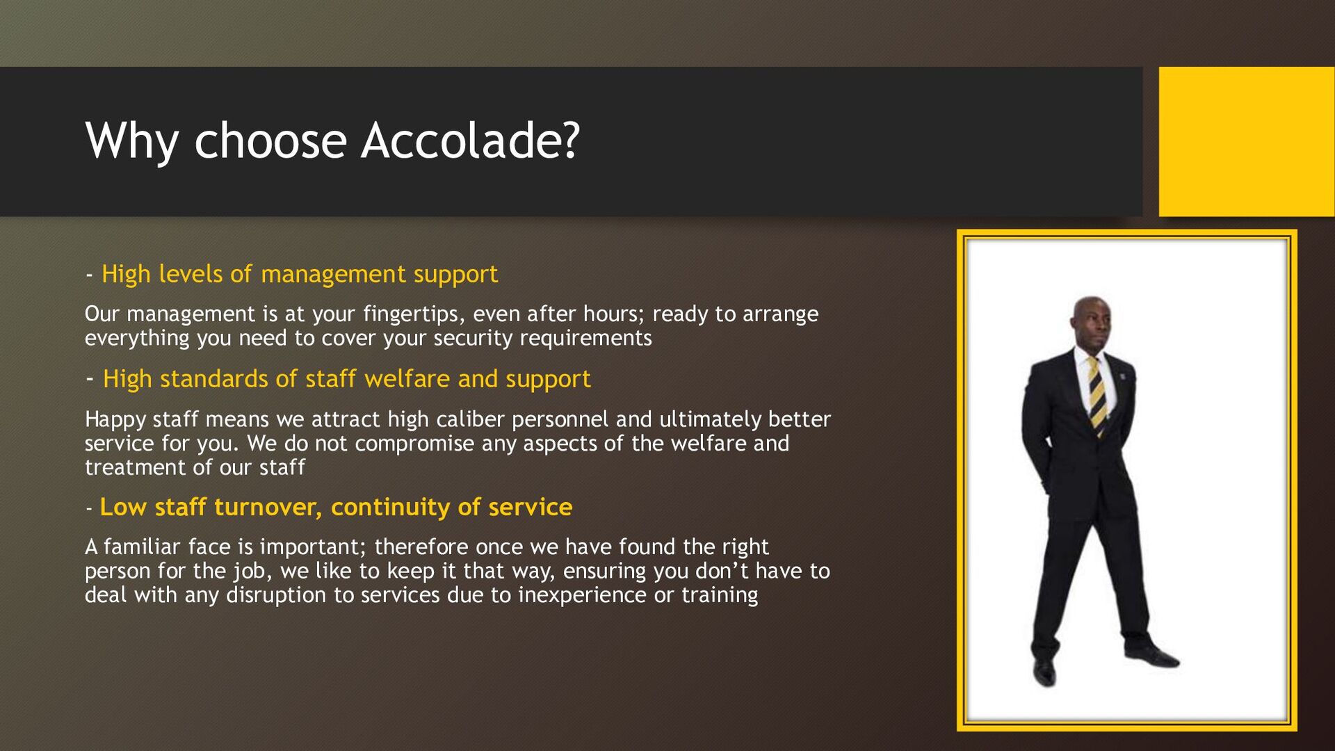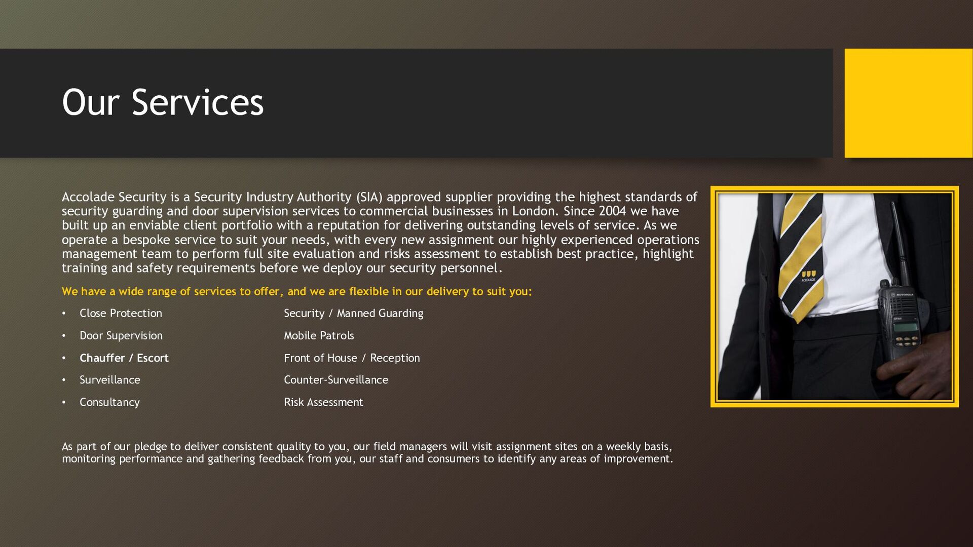 Accolade Security Company in London is a leader in providing an expansive range of solutions for a full range of clients, ranging from private individuals to global corporations. Accolade Security was founded on 6th August 2004 with the aim of providing quality security services at affordable prices.