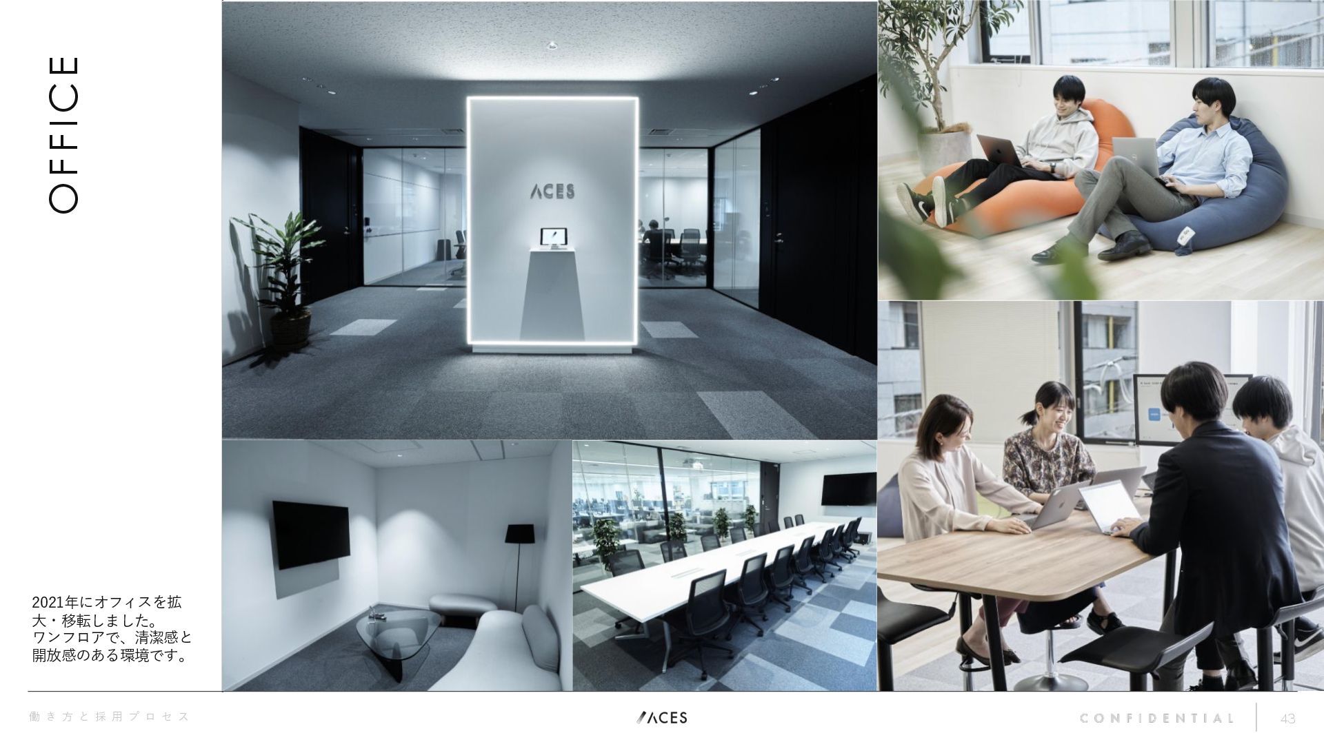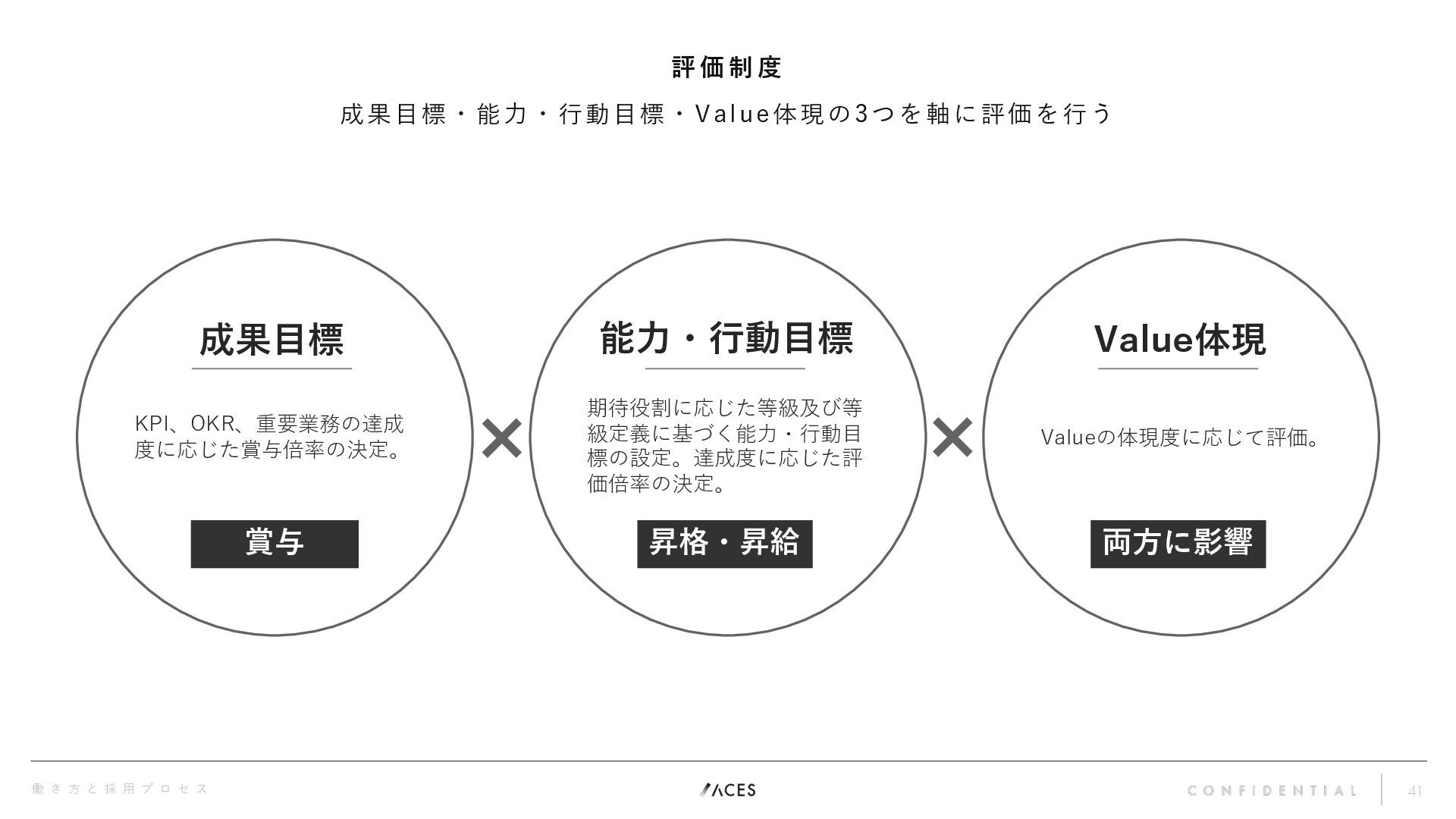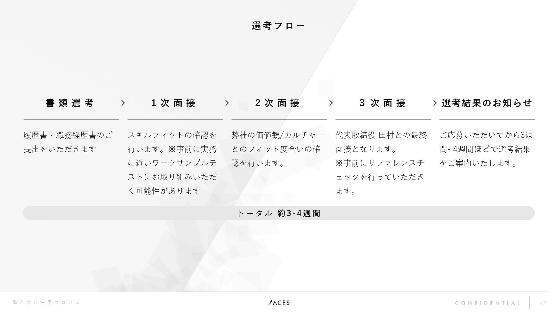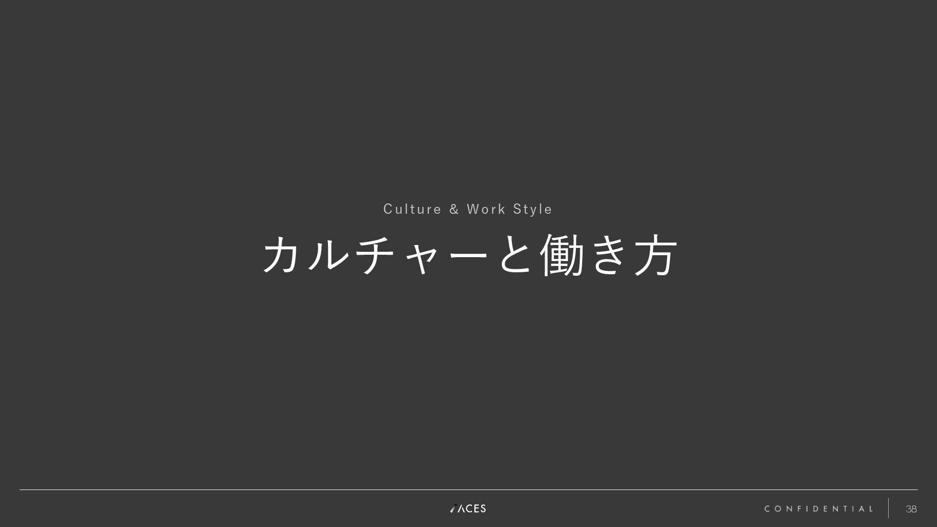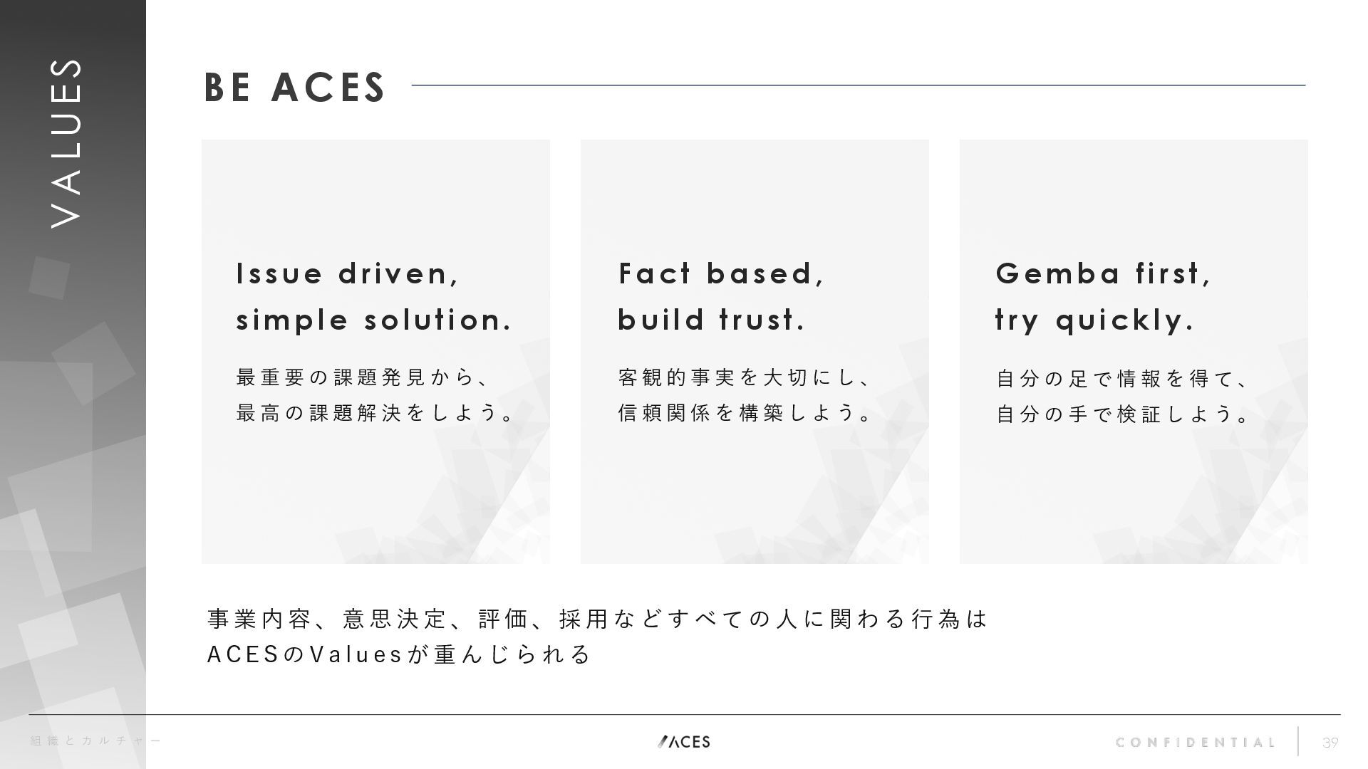 BE ACES 事 業 内 容 、 意 思 決 定 、 評 価 、 採 ⽤ な ど す べ て の ⼈ に 関 わ る ⾏ 為 は A C E S の V a l u e s が 重 ん じ ら れ る I ssu e d riv en , simp le solu t ion . 最 重 要 の 課 題 発 ⾒ か ら 、 最 ⾼ の 課 題 解 決 を し よ う 。 Gemb a f irst , t ry q uick ly . ⾃ 分 の ⾜ で 情 報 を 得 て 、 ⾃ 分 の ⼿ で 検 証 し よ う 。 F a ct b a sed , b uild trust. 客 観 的 事 実 を ⼤ 切 に し 、 信 頼 関 係 を 構 築 し よ う 。