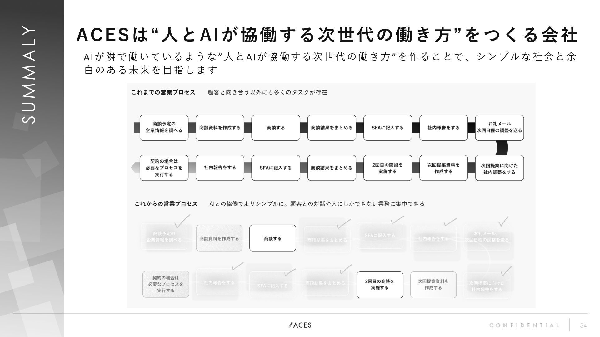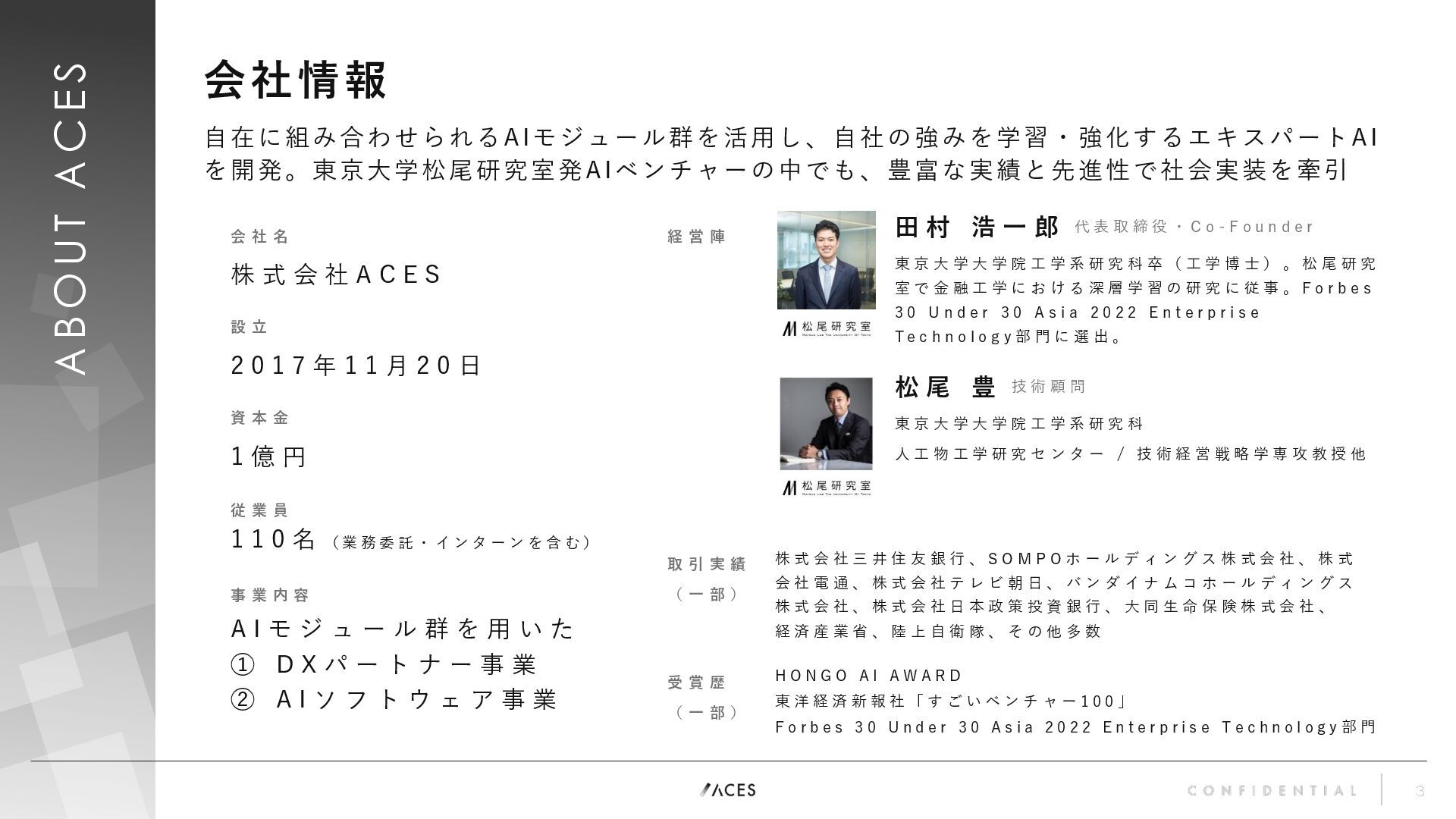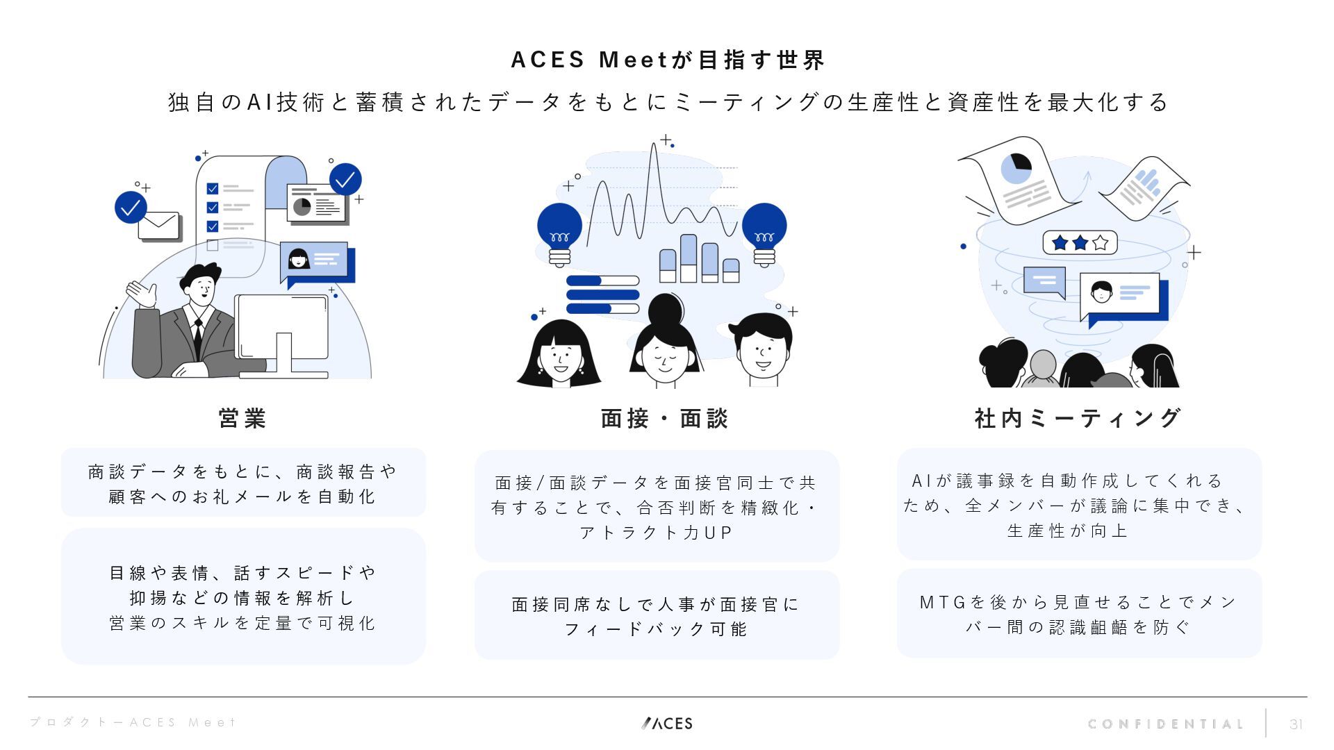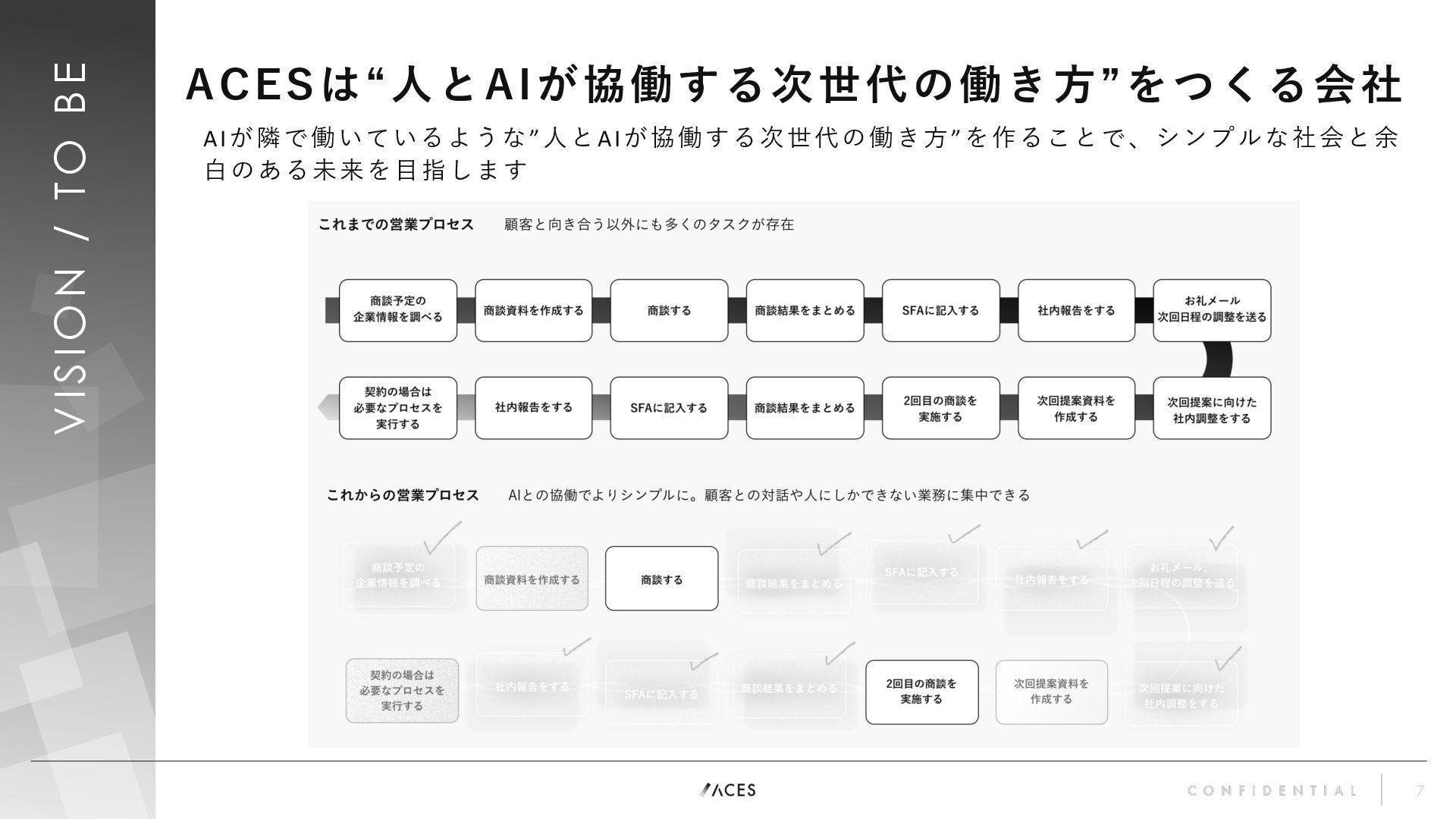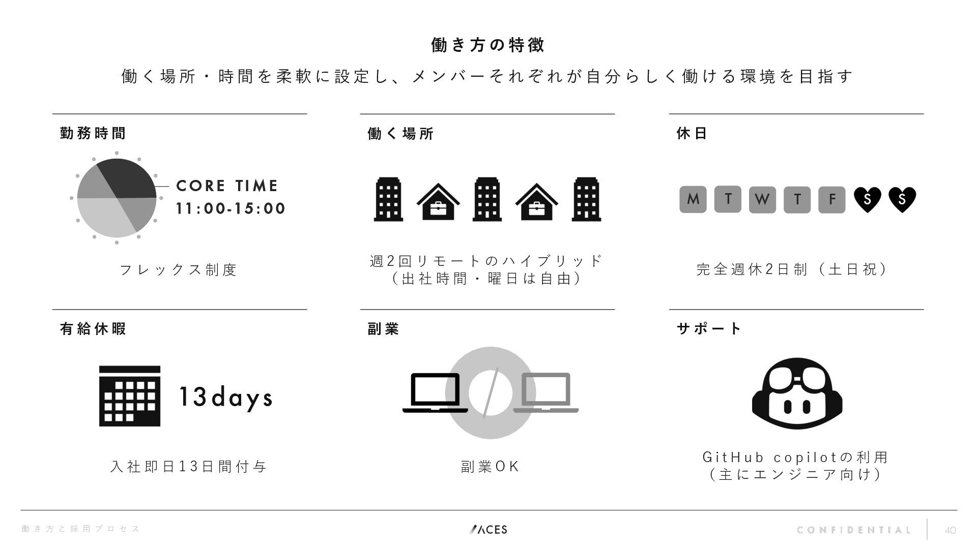 BE ACES 事 業 内 容 、 意 思 決 定 、 評 価 、 採 ⽤ な ど す べ て の ⼈ に 関 わ る ⾏ 為 は A C E S の V a l u e s が 重 ん じ ら れ る I ssu e d riv en , simp le solu t ion . 最 重 要 の 課 題 発 ⾒ か ら 、 最 ⾼ の 課 題 解 決 を し よ う 。 Gemb a f irst , t ry q uick ly . ⾃ 分 の ⾜ で 情 報 を 得 て 、 ⾃ 分 の ⼿ で 検 証 し よ う 。 F a ct b a sed , b uild trust. 客 観 的 事 実 を ⼤ 切 に し 、 信 頼 関 係 を 構 築 し よ う 。