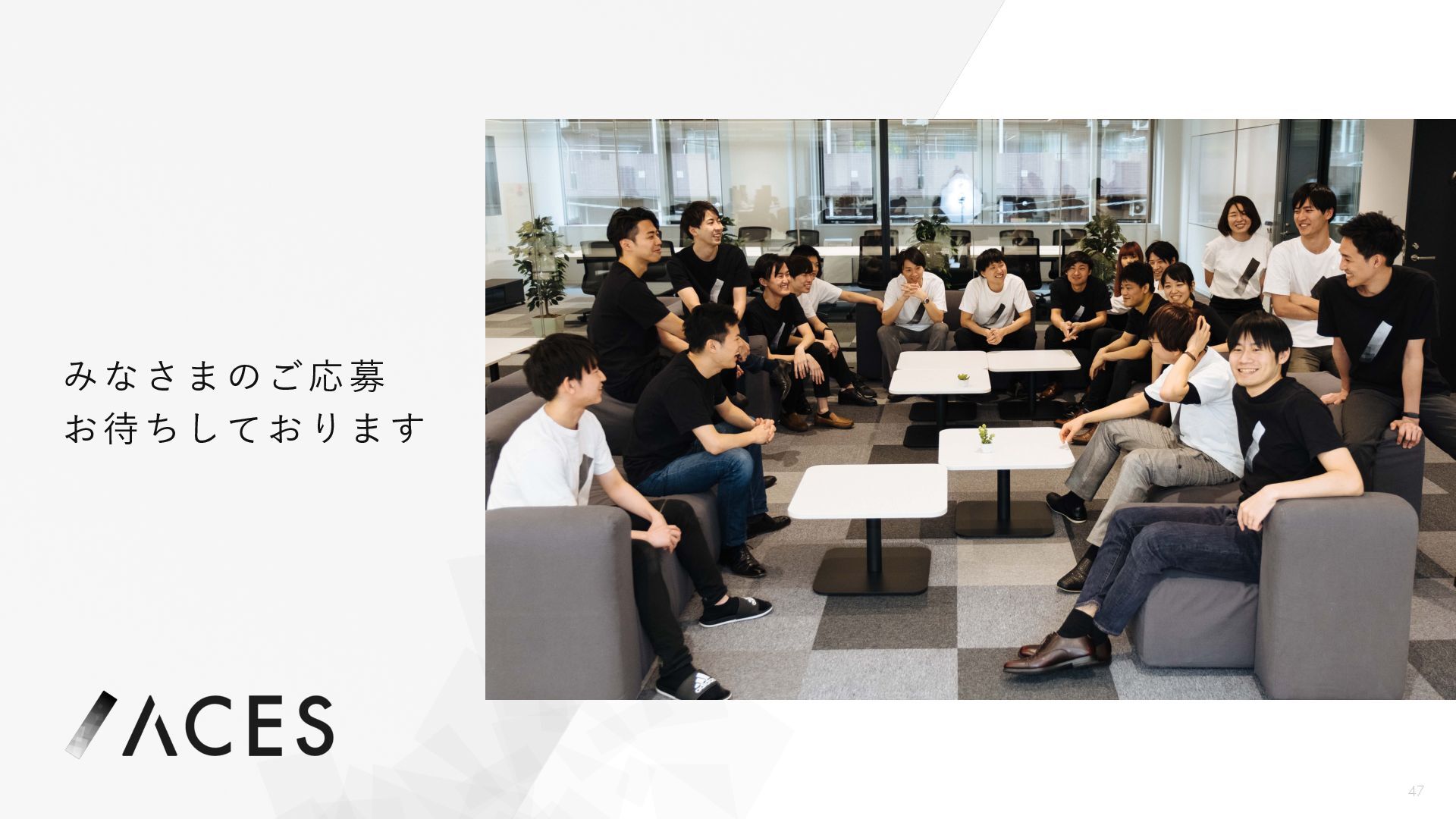 BE ACES 事 業 内 容 、 意 思 決 定 、 評 価 、 採 ⽤ な ど す べ て の ⼈ に 関 わ る ⾏ 為 は A C E S の Va l u e s が 重 ん じ ら れ る I ssu e d riv en , simp le solu t ion . 最 重 要 の 課 題 発 ⾒ か ら 、 最 ⾼ の 課 題 解 決 を し よ う 。 Gemb a f irst , t ry q uick ly . ⾃ 分 の ⾜ で 情 報 を 得 て 、 ⾃ 分 の ⼿ で 検 証 し よ う 。 F a ct b a sed , b uild trust. 客 観 的 事 実 を ⼤ 切 に し 、 信 頼 関 係 を 構 築 し よ う 。