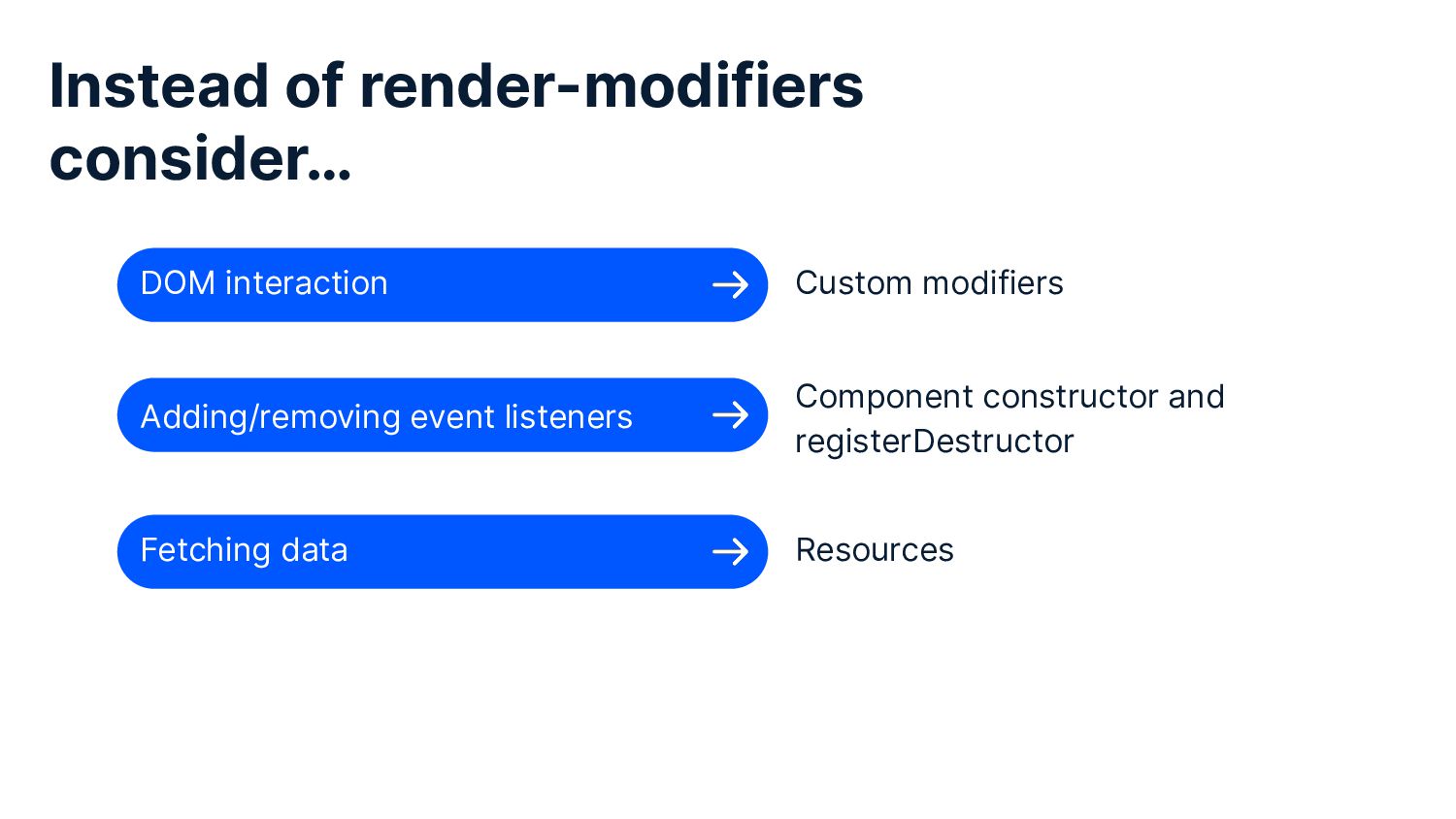 In this talk I’m explain why these modifiers are problematic and explore the two main use cases I’ve seen ember-render-modifiers used for and how we can go about replacing them with modern Ember patterns that will set us up for success in the future. And finally, after this talk, we’ll have a resource to which we can point future engineers when they scratch their heads about how to avoid these modifiers.