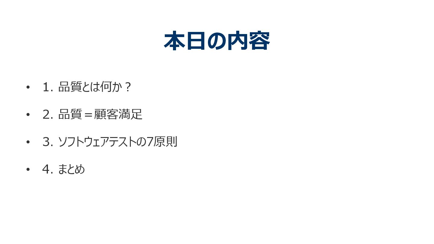 本日の内容 • 1. 品質とは何か? • 2. 品質=顧客満足 • 3. ソフトウェアテストの7原則