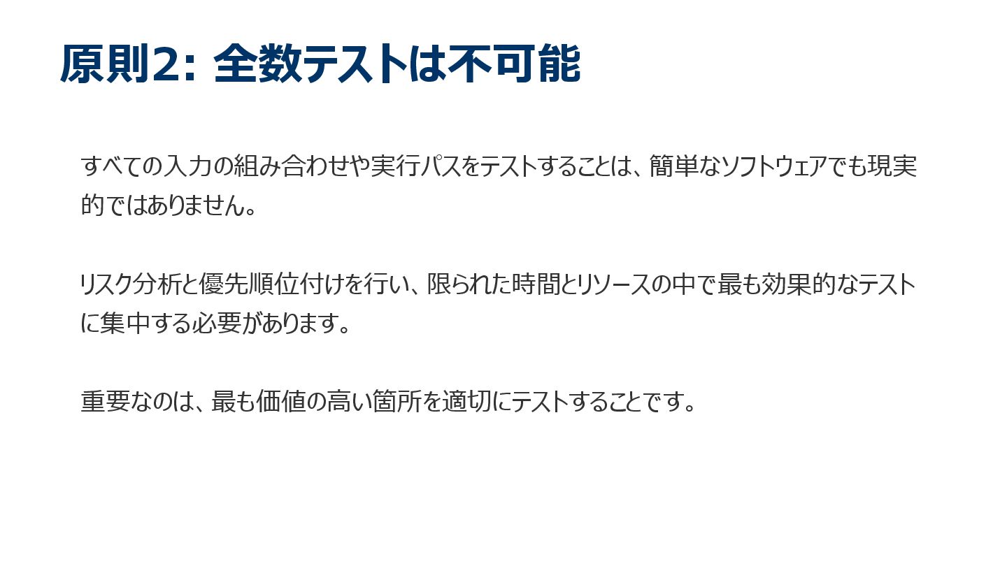 原則2: 全数テストは不可能 すべての入力の組み合わせや実行パスをテストすることは、簡単なソフトウェアでも現実 的ではありません。 リスク分析と優先順位付けを行い、限られた時間とリソースの中で最も効果的なテスト に集中する必要があります。 重要なのは、最も価値の高い箇所を適切にテストすることです。