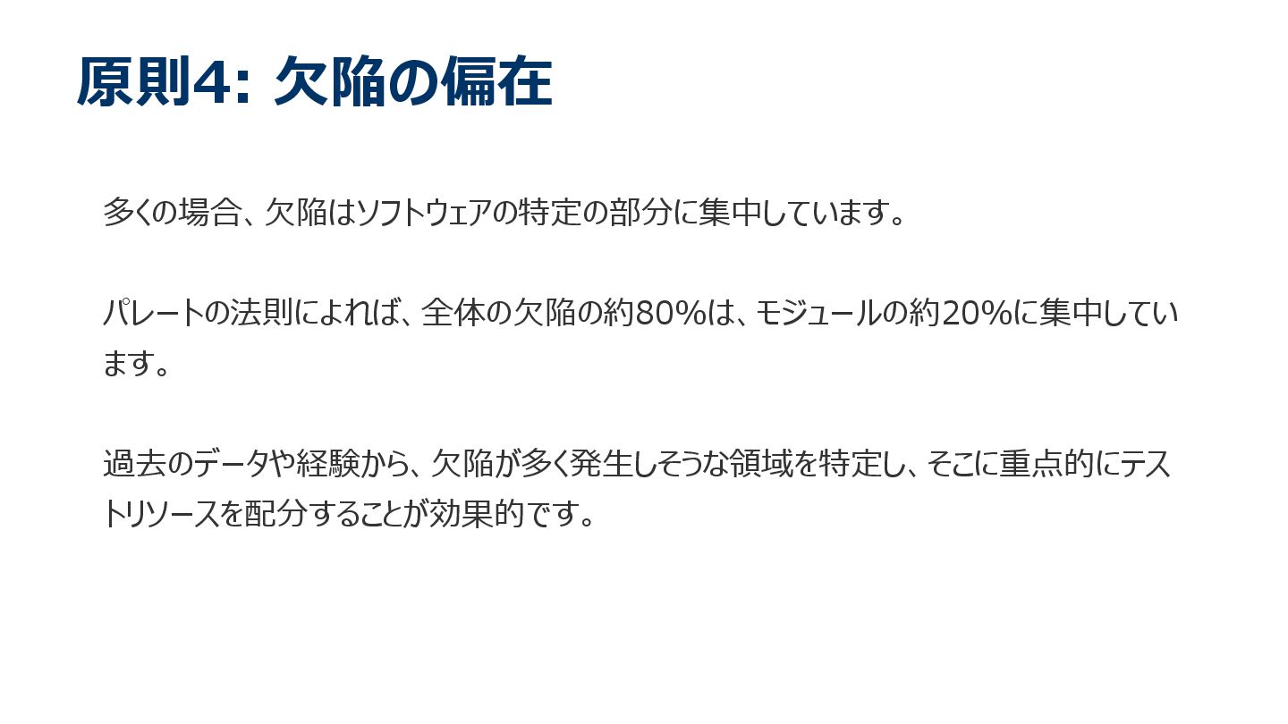 原則4: 欠陥の偏在 多くの場合、欠陥はソフトウェアの特定の部分に集中しています。 パレートの法則によれば、全体の欠陥の約80%は、モジュールの約20%に集中してい ます。 過去のデータや経験から、欠陥が多く発生しそうな領域を特定し、そこに重点的にテス トリソースを配分することが効果的です。