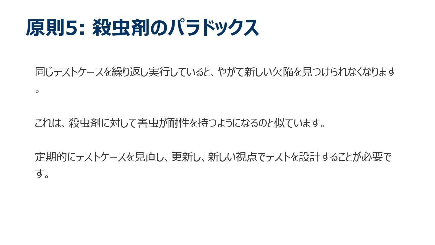 原則5: 殺虫剤のパラドックス 同じテストケースを繰り返し実行していると、やがて新しい欠陥を見つけられなくなります 。 これは、殺虫剤に対して害虫が耐性を持つようになるのと似ています。 定期的にテストケースを見直し、更新し、新しい視点でテストを設計することが必要で す。
