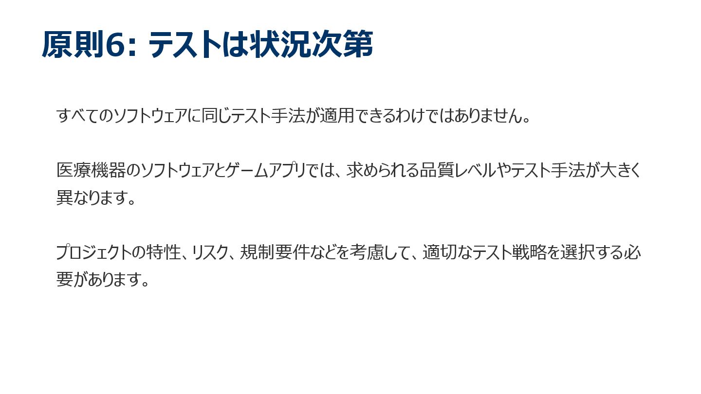 原則6: テストは状況次第 すべてのソフトウェアに同じテスト手法が適用できるわけではありません。 医療機器のソフトウェアとゲームアプリでは、求められる品質レベルやテスト手法が大きく 異なります。 プロジェクトの特性、リスク、規制要件などを考慮して、適切なテスト戦略を選択する必 要があります。