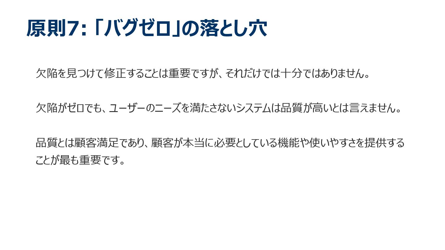 原則7: 「バグゼロ」の落とし穴 欠陥を見つけて修正することは重要ですが、それだけでは十分ではありません。 欠陥がゼロでも、ユーザーのニーズを満たさないシステムは品質が高いとは言えません。 品質とは顧客満足であり、顧客が本当に必要としている機能や使いやすさを提供する ことが最も重要です。