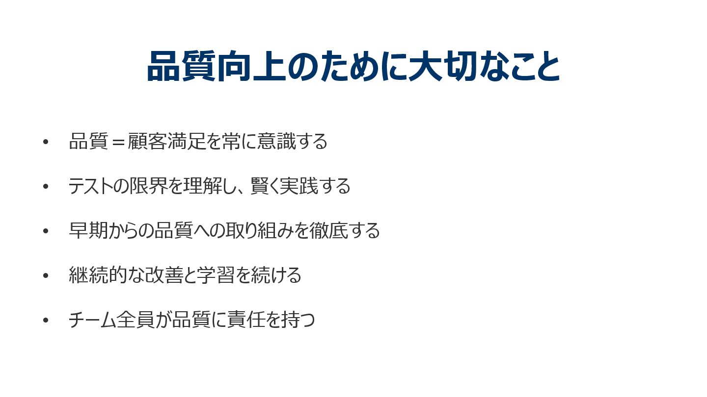 品質向上のために大切なこと • 品質=顧客満足を常に意識する • テストの限界を理解し、賢く実践する • 早期からの品質への取り組みを徹底する • 継続的な改善と学習を続ける •