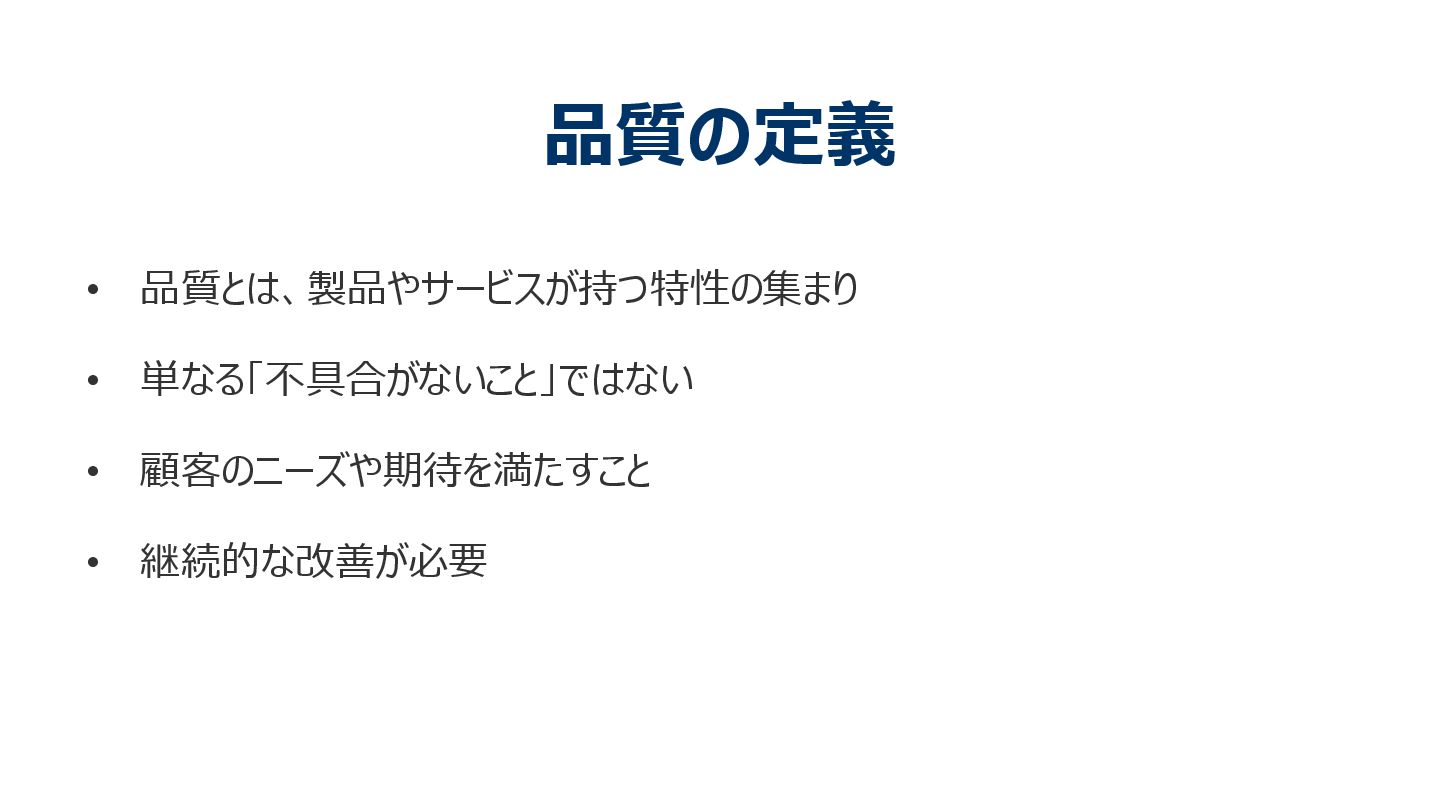 品質の定義 • 品質とは、製品やサービスが持つ特性の集まり • 単なる「不具合がないこと」ではない • 顧客のニーズや期待を満たすこと • 継続的な改善が必要