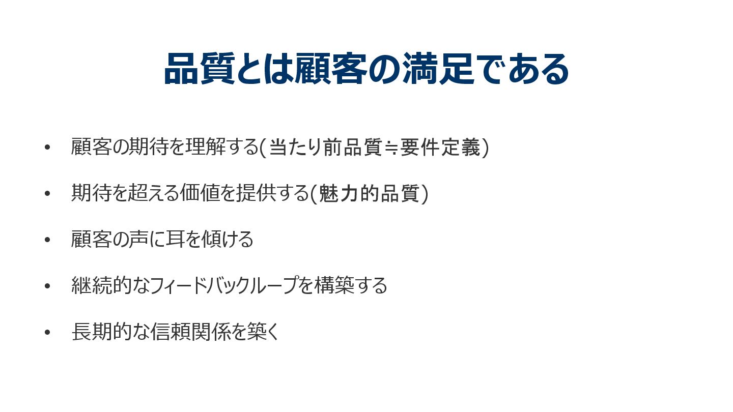 品質とは顧客の満足である • 顧客の期待を理解する(当たり前品質≒要件定義) • 期待を超える価値を提供する(魅力的品質) • 顧客の声に耳を傾ける • 継続的なフィードバックループを構築する •