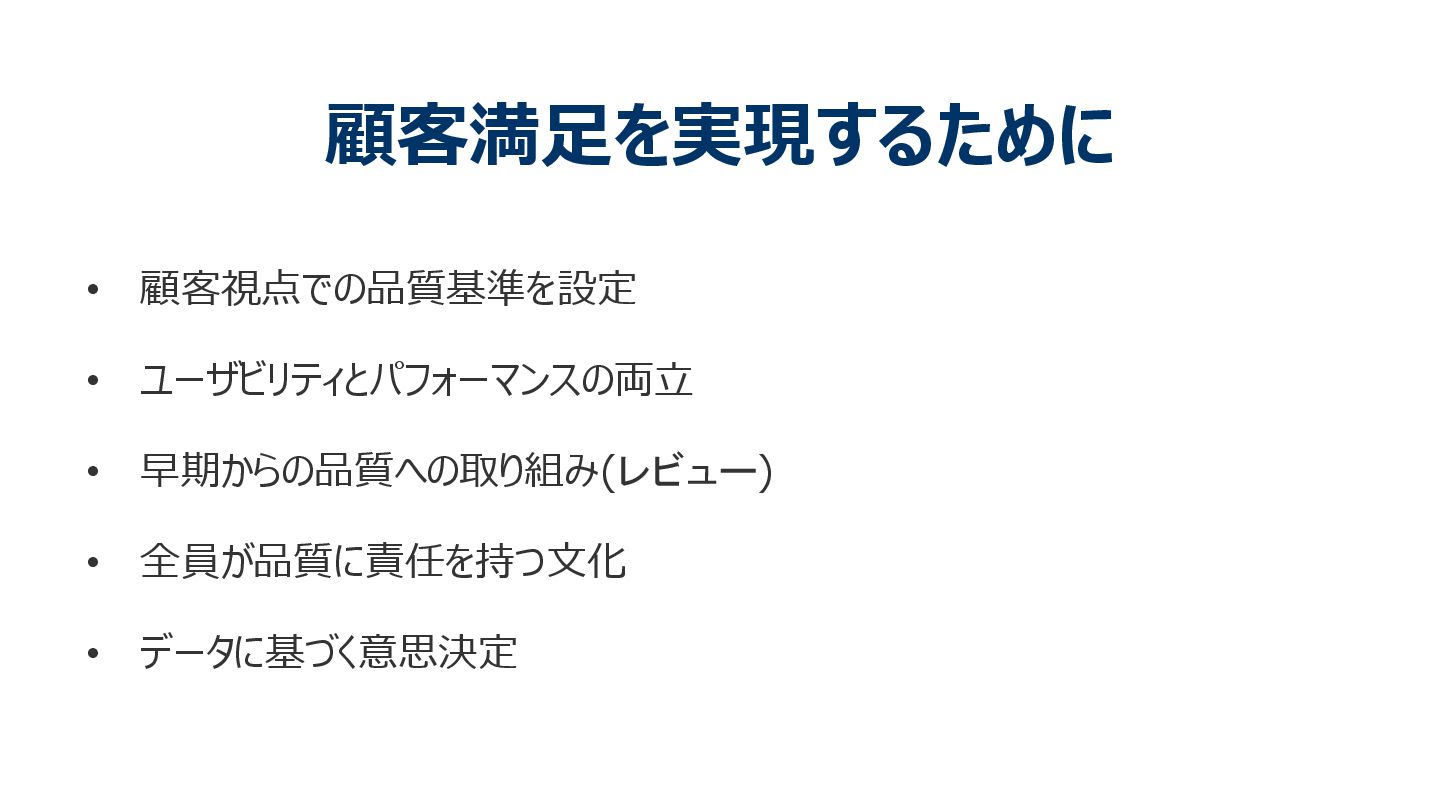顧客満足を実現するために • 顧客視点での品質基準を設定 • ユーザビリティとパフォーマンスの両立 • 早期からの品質への取り組み(レビュー) • 全員が品質に責任を持つ文化 •