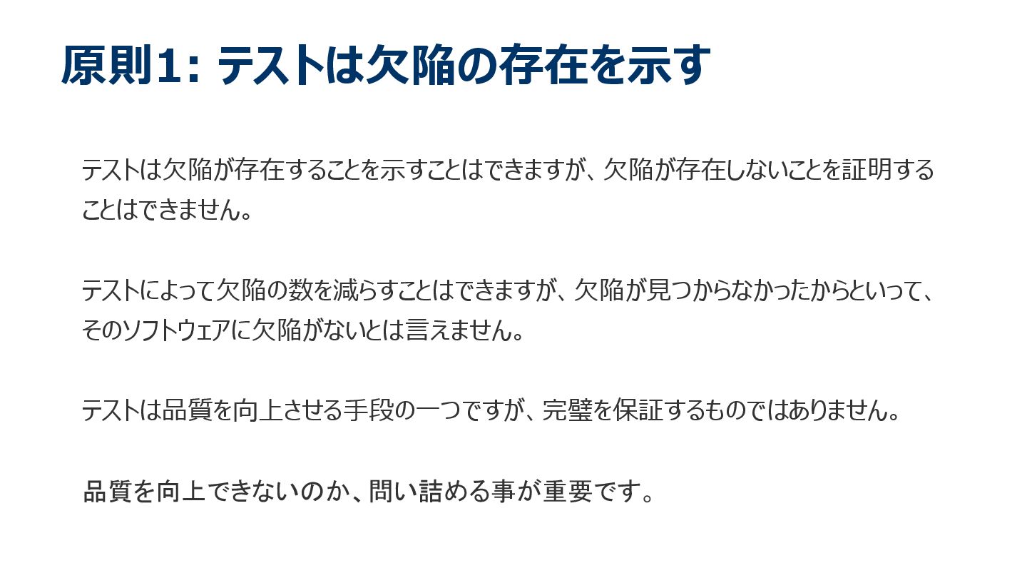 原則1: テストは欠陥の存在を示す テストは欠陥が存在することを示すことはできますが、欠陥が存在しないことを証明する ことはできません。 テストによって欠陥の数を減らすことはできますが、欠陥が見つからなかったからといって、 そのソフトウェアに欠陥がないとは言えません。 テストは品質を向上させる手段の一つですが、完璧を保証するものではありません。 品質を向上できないのか、問い詰める事が重要です。