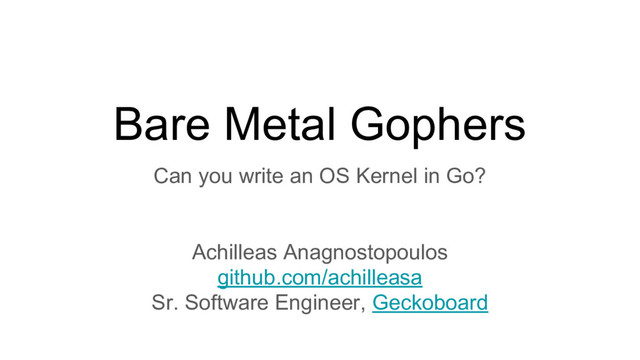 Slides for my GolangUK '17 talk. Abstract: Go is a great language for building server applications but can you use it to write an OS kernel? Let's talk about the challenges involved in writing, compiling and linking Go code that runs in Ring-0 and code a simple "Hello World" demo.