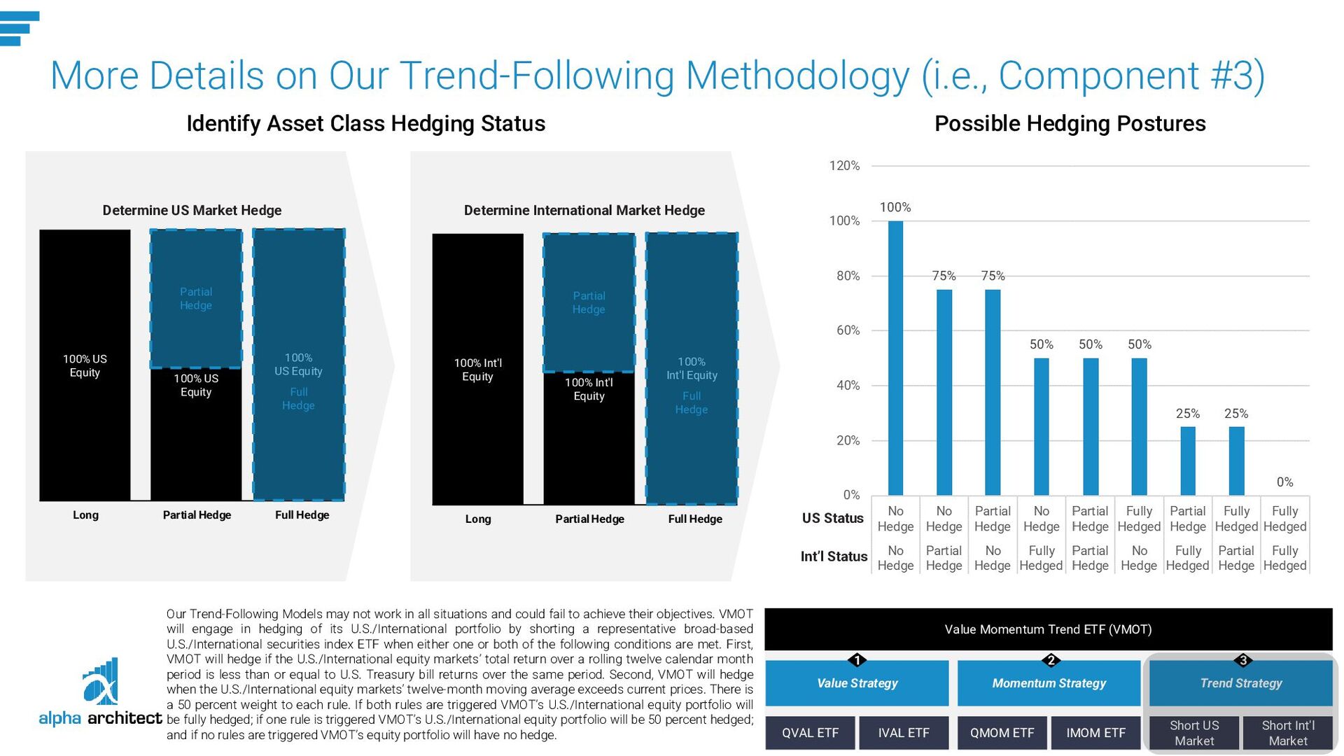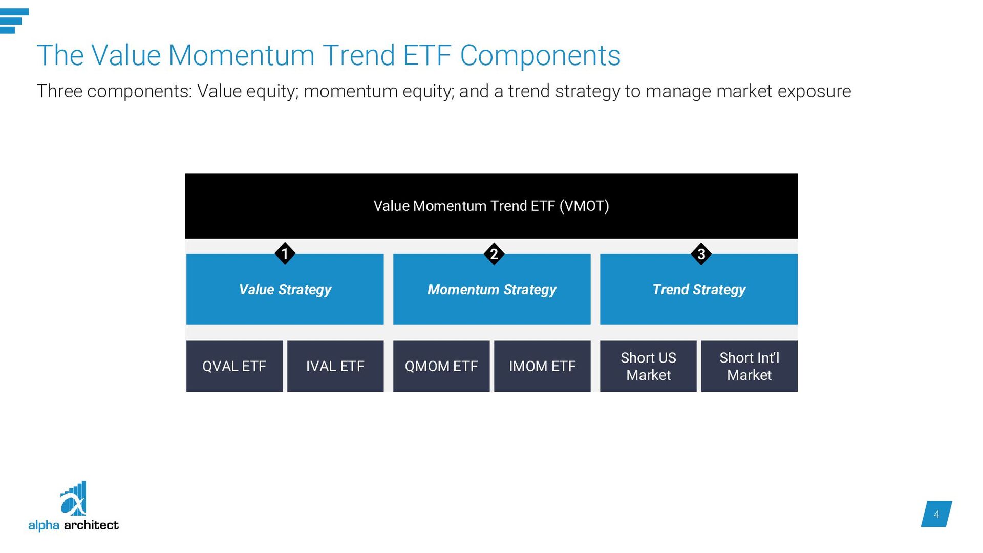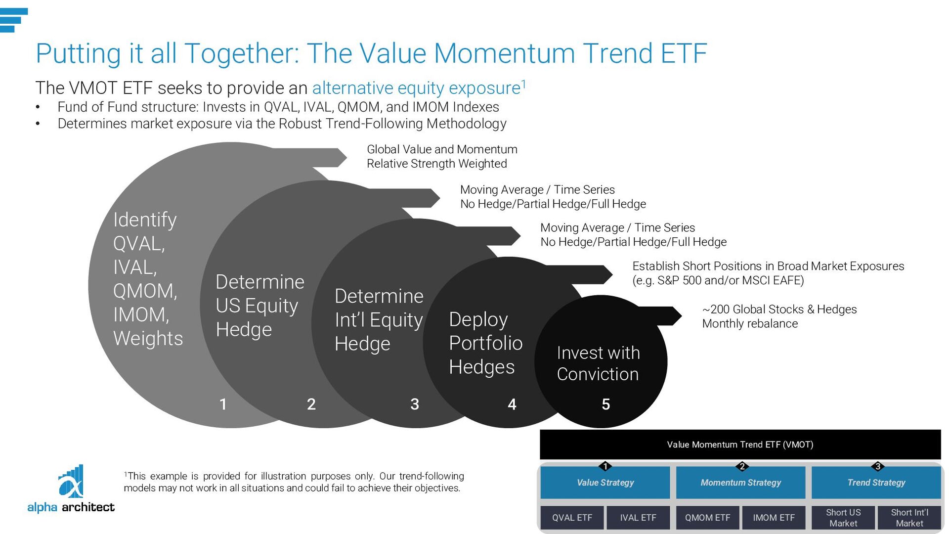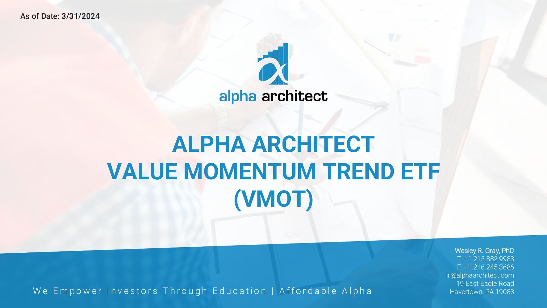 is possible. Redemptions are limited and often commissions are charged on each trade. Unlike mutual funds, ETFs may trade at a premium or discount to their net asset value. The Securities and Exchange Commission (SEC) does not approve or disapprove of any investment. This material has been distributed for informational purposes only and should not be considered as investment advice or a recommendation of any particular security, strategy or investment product. Information contained herein has been obtained from sources believed to be reliable, but not guaranteed. No part of this material may be reproduced in any form, or referred to in any other publication, without express written permission. References to other funds should not to be interpreted as an offer of these securities. The Funds are distributed by Quasar Distributors, LLC. The Fund investment advisor is Empowered Funds, LLC, which is doing business as Alpha Architect. Value investing is subject to the risk that intrinsic values of investments may not be recognized by the broad market or that their prices may decline. Investments utilizing quantitative methods may perform differently than the market as a result of characteristics and data used and changes in trends. Investments in foreign securities involve political, economic and currency risks, greater volatility and differences in accounting methods. These risks are magnified in emerging markets. Momentum investing is investing in or having exposure to securities with positive momentum entails investing in securities that have had above-average recent returns. These securities may be more volatile than a broad cross-section of securities. Returns on securities that have previously exhibited momentum may be less than returns on other styles of investing or the overall stock market. Momentum can turn quickly and cause significant variation from other types of investments, and stocks that previously exhibited high momentum may not experience continued positive momentum. In addition, there may be periods when the momentum style is out of favor, and during which the investment performance of the Fund using a momentum strategy may suffer. As of January 31, 2022, each Fund is now actively managed by its investment adviser, Empowered Funds, LLC. Performance after January 31, 2022 reflects the fund's current objective reflected in this material and current prospectus. Maintaining investments regardless of market conditions or the performance of an individual investment could cause the Funds' returns to be lower than if the Funds employed an active strategy. The performance of the Funds and their Indices may differ due to tracking error. Because it invests primarily in other funds, the Value Momentum Trend Fund’s investment performance largely depends on the investment performance of those underlying Alpha Architect ETFs. An investor will indirectly bear the principal risks and its share of the fees and expenses of the underlying funds. Derivatives can be volatile and involve various types and degrees of risks including hedging risk. The use of derivatives in connection with the Alpha Architect Value Momentum Trend Index’s hedging strategies may expose the Index (and therefore the Value Momentum Trend Fund) to losses (some of which may be sudden) that it would not have otherwise been exposed to if it had only invested directly in equity securities. The Funds' investment objectives, risks, charges and expenses must be considered carefully before investing. The statutory and summary prospectus contains this and other important information about the investment company. Click here for the VMOT Prospectus and SAI. All fund documents can be found at https://etfsite.alphaarchitect.com/documents/. A free hardcopy of any prospectus may be obtained by calling +1.215.882.9983. Read carefully before investing.