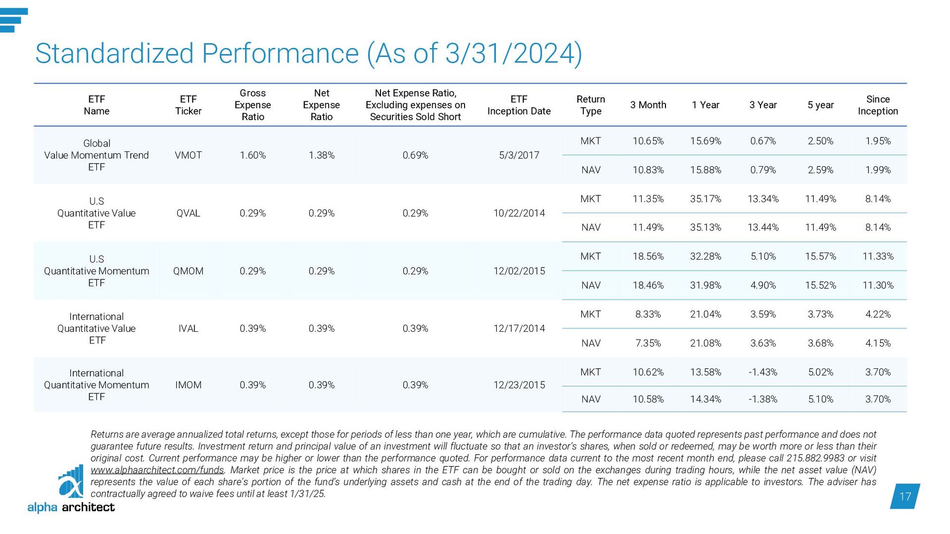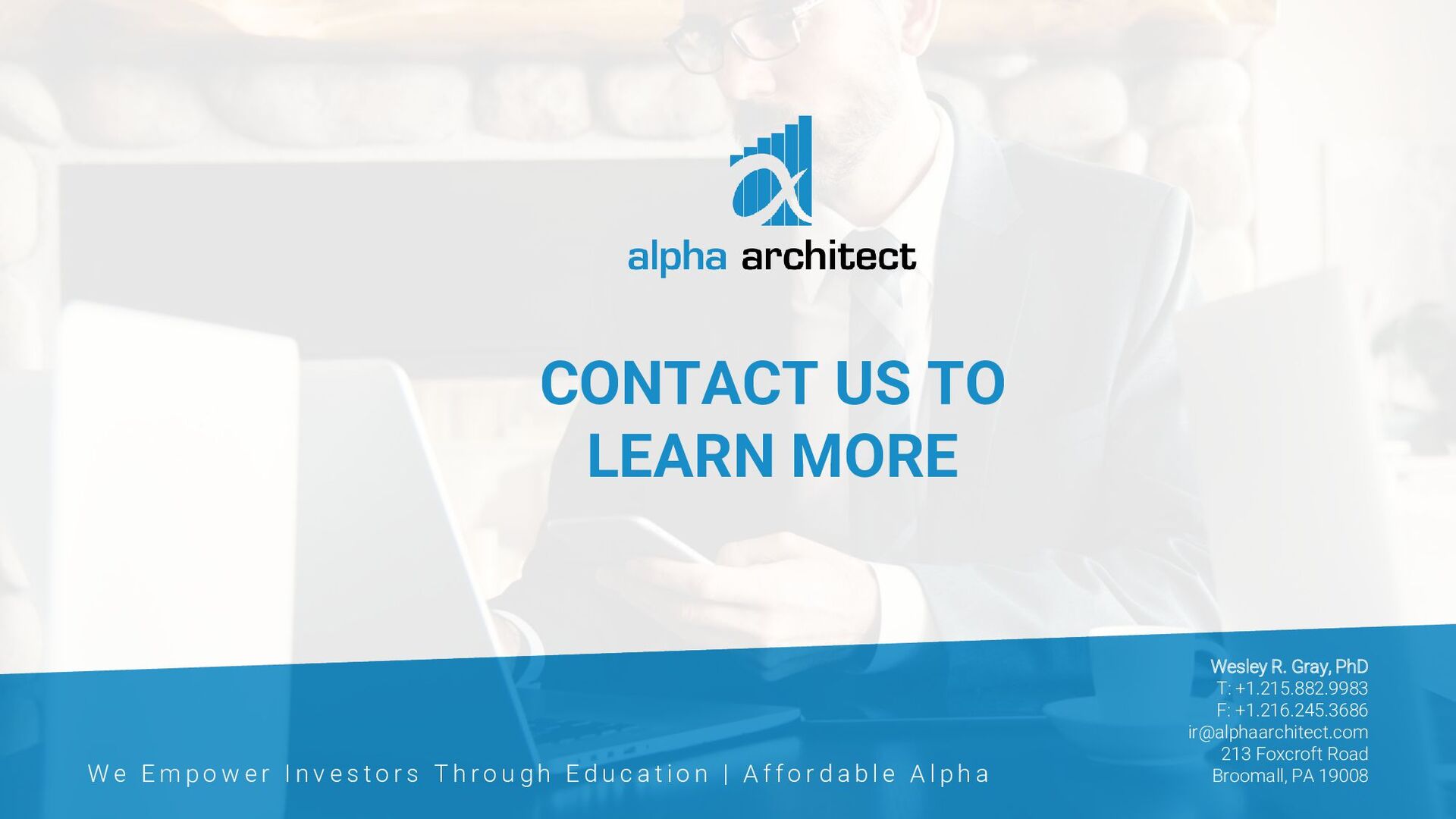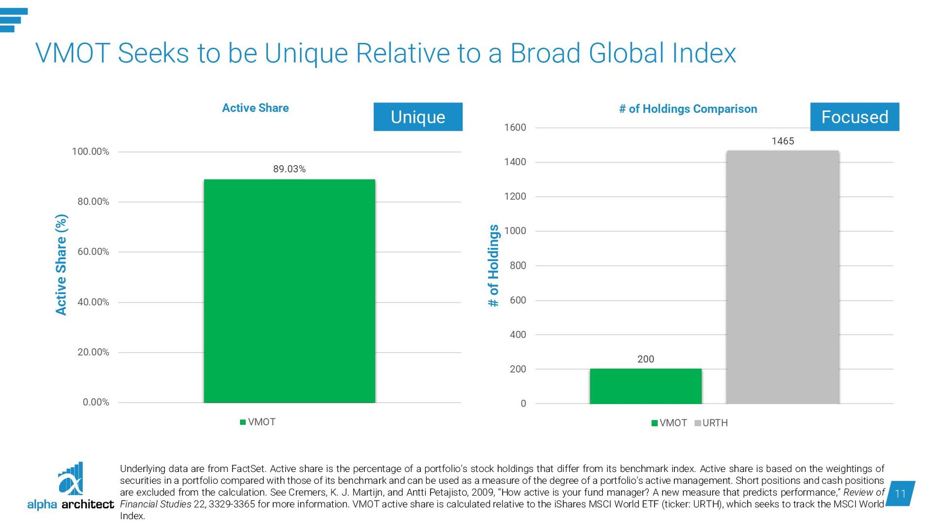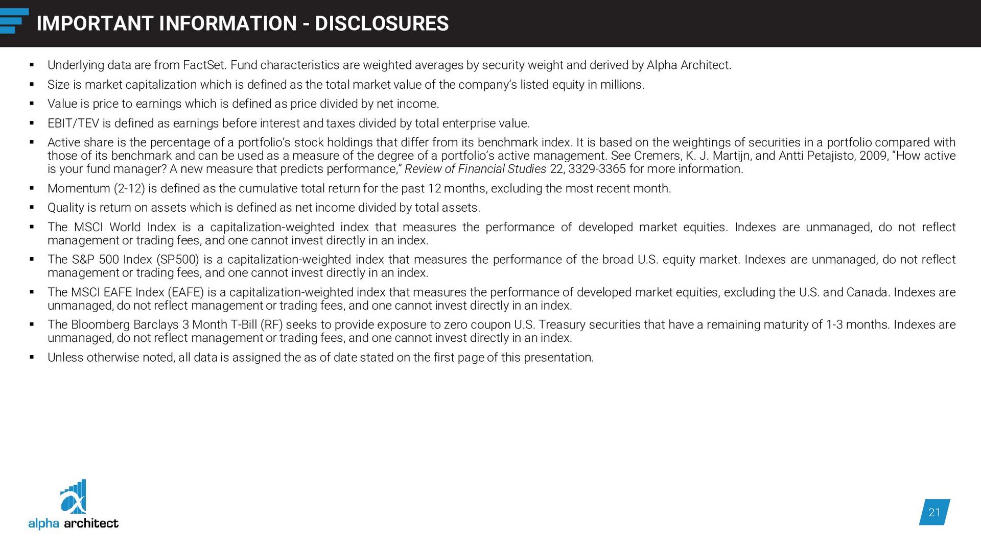 is possible. Redemptions are limited and often commissions are charged on each trade. Unlike mutual funds, ETFs may trade at a premium or discount to their net asset value. The Securities and Exchange Commission (SEC) does not approve or disapprove of any investment. This material has been distributed for informational purposes only and should not be considered as investment advice or a recommendation of any particular security, strategy or investment product. Information contained herein has been obtained from sources believed to be reliable, but not guaranteed. No part of this material may be reproduced in any form, or referred to in any other publication, without express written permission. References to other funds should not to be interpreted as an offer of these securities. The Funds are distributed by Quasar Distributors, LLC. The Fund investment advisor is Empowered Funds, LLC, which is doing business as Alpha Architect. Value investing is subject to the risk that intrinsic values of investments may not be recognized by the broad market or that their prices may decline. Investments utilizing quantitative methods may perform differently than the market as a result of characteristics and data used and changes in trends. Investments in foreign securities involve political, economic and currency risks, greater volatility and differences in accounting methods. These risks are magnified in emerging markets. Momentum investing is investing in or having exposure to securities with positive momentum entails investing in securities that have had above-average recent returns. These securities may be more volatile than a broad cross-section of securities. Returns on securities that have previously exhibited momentum may be less than returns on other styles of investing or the overall stock market. Momentum can turn quickly and cause significant variation from other types of investments, and stocks that previously exhibited high momentum may not experience continued positive momentum. In addition, there may be periods when the momentum style is out of favor, and during which the investment performance of the Fund using a momentum strategy may suffer. As of January 31, 2022, each Fund is now actively managed by its investment adviser, Empowered Funds, LLC. Performance after January 31, 2022 reflects the fund's current objective reflected in this material and current prospectus. Maintaining investments regardless of market conditions or the performance of an individual investment could cause the Funds' returns to be lower than if the Funds employed an active strategy. The performance of the Funds and their Indices may differ due to tracking error. Because it invests primarily in other funds, the Value Momentum Trend Fund’s investment performance largely depends on the investment performance of those underlying Alpha Architect ETFs. An investor will indirectly bear the principal risks and its share of the fees and expenses of the underlying funds. Derivatives can be volatile and involve various types and degrees of risks including hedging risk. The use of derivatives in connection with the Alpha Architect Value Momentum Trend Index’s hedging strategies may expose the Index (and therefore the Value Momentum Trend Fund) to losses (some of which may be sudden) that it would not have otherwise been exposed to if it had only invested directly in equity securities. The Funds' investment objectives, risks, charges and expenses must be considered carefully before investing. The statutory and summary prospectus contains this and other important information about the investment company. Click here for the VMOT Prospectus and SAI. All fund documents can be found at https://etfsite.alphaarchitect.com/documents/. A free hardcopy of any prospectus may be obtained by calling +1.215.882.9983. Read carefully before investing.