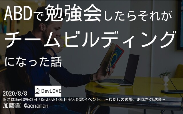 ABDで 勉強会したらそれが チームビルディング になった話 2020/8/8 6/21はDevLOVEの日!DevLOVE13年目突入記念イベント 〜わたしの現場、あなたの現場〜 加藤翼 @acnaman