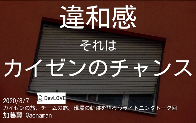 違和感 それは カイゼンのチャンス 2020/8/7 カイゼンの旅、チームの旅。現場の軌跡を語ろうライトニングトーク回 加藤翼 @acnaman