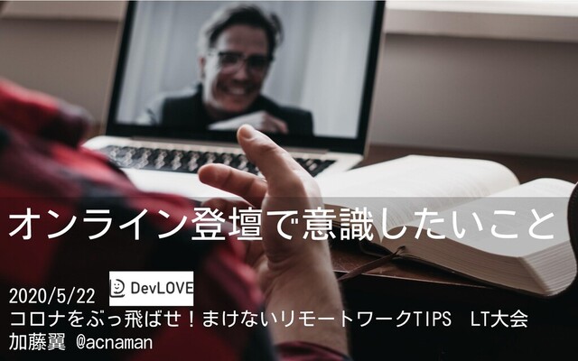 オンライン登壇で意識したいこと 2020/5/22 コロナをぶっ飛ばせ!まけないリモートワークTIPS LT大会 加藤翼 @acnaman
