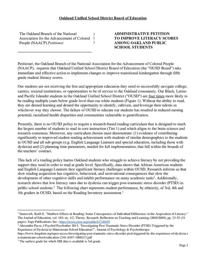 special education services which are nearly four times as expensive as classroom instruction, destabilizes district finances, compromises the ability to provide adequate services to students, and undermines the opportunity to allocate more resources towards competitive salaries for employees. This is, therefore, a critical important matter of fiscal solvency. A Department of Justice Report clearly states that criminality and recidivism is “welded” to low reading scores, and that research-based reading instruction can be used to reduce recidivism and increase employment opportunity.6 Given that the bipartisan First Step Act, signed into law by President Trump in 2019, provides dyslexia screening and research-based instructional support for individuals entering federal prison, OUSD has an obligation to provide its students with at least a similar level of care, which includes dyslexia screening and research-based support, curriculum and instruction. Our students should not have to wait for future entry into the federal prison system to receive the support they need to become college and career ready. The OUSD Board has the authority to grant these actions and lay the groundwork for a meaningful and sustained effort to significantly improve literacy rates in the district. Any agenda or roadmap which does not address the root of the school-to-prison pipeline, illiteracy, is incomplete. STATEMENT OF FACTS Presently, OUSD’s adopted kindergarten through fifth grade curriculum, Units of Study, has not satisfactorily supported the acquisition of foundational literacy skills. Previous to August 2020, the OUSD Assessment for early reading, has measured the skill of patterned reading rather than acquisition of foundational literacy skills. The district has promoted the use of Leveled Reading Groups in which students were regularly denied access to grade level text, content, and materials. Indeed, many students went entire years without being allowed to read a book or engage with the designated content that was at their grade level. Moreover, the author of OUSD’s previously adopted core curriculum, Units of Study, now acknowledges its inadequate support for students in need of foundational skills.7 The double edged sword of choosing a curriculum with limited foundational reading skill development while simultaneously restricting access to grade level text to students with grade level reading skills, has created racialized and economic impacts which privilege those with the resources and advocacy to supplement the development of reading skill. This sword of inequity, creating and justifying the denial of students’ access to grade level text and content, was welded by institutional leaders who failed to evaluate their educational practices and philosophies using the prisms of the reading research consensus, brain science, or the students’ civil rights. Additionally, the district is lacking in overall compliance with AB1369 which ensures that all students referred for testing be screened for phonological processing challenges. There’s a lack of training and awareness related to the law and its implications. Mitigating these gaps requires resources, personal bandwidth, and advocacy, which are often unavailable to families and students. District-wide conditions related to staff turnover, budgetary constraints, and other related issues exacerbate these inequalities and further contribute to negative, racial and class outcomes. 6 National Institute of Justice, Office of Justice Programs, U.S. Department of Justice (1993), Michael S. Brunner. Reduced Recidivism and Increase Employment Opportunity Through Research-Based Reading Instruction. https://www.ncjrs.gov/pdffiles1/Digitization/141324NCJRS.pdf 7 https://blog.heinemann.com/note-from-lucy-calkins Page 3